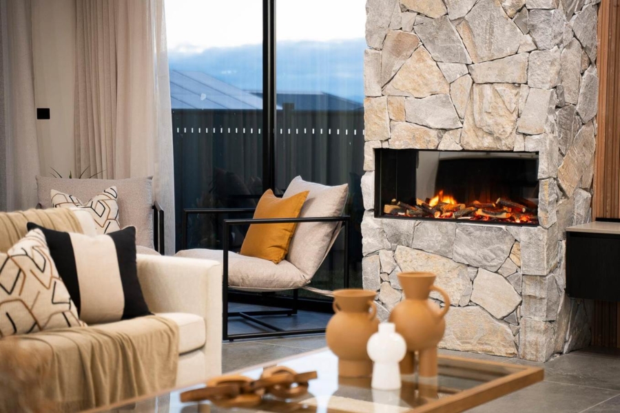 Whether double-sided or flush-mounted, a tiled fireplace surround featuring fireplace cladding tiles in dark-toned stone or irregular slate delivers sculptural weight and heat resistance.