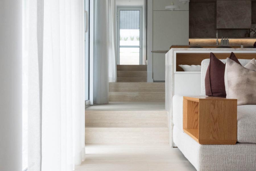 Large-format limestone tiles visually expand open spaces and enhance spatial flow. Travertine in vein-cut form adds rhythm and subtle contrast when used as a fireplace surround or vertical panel.