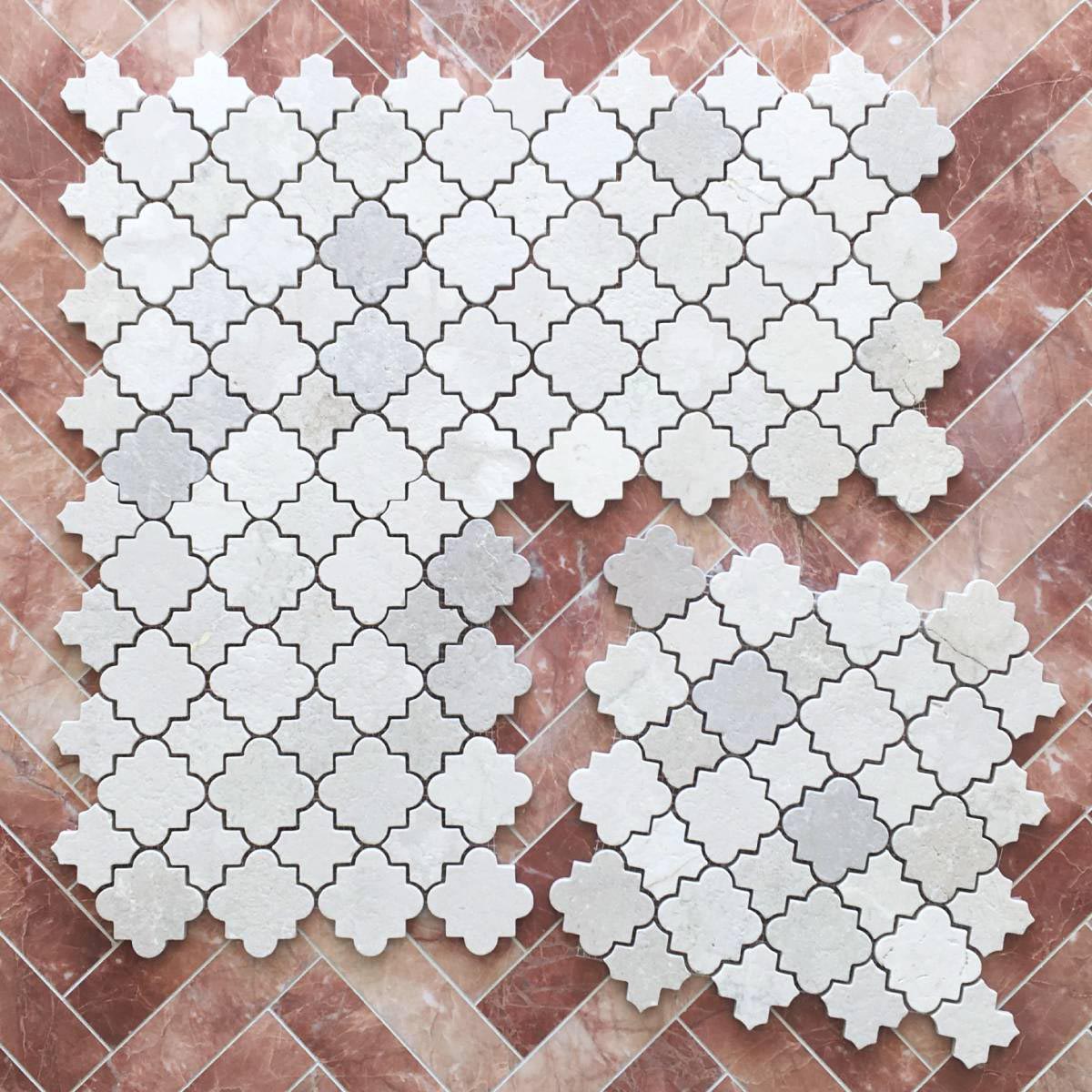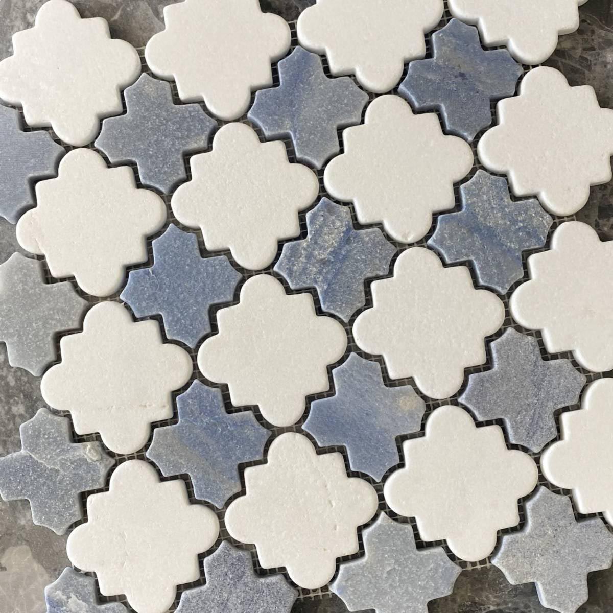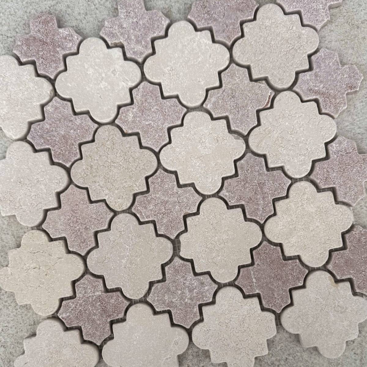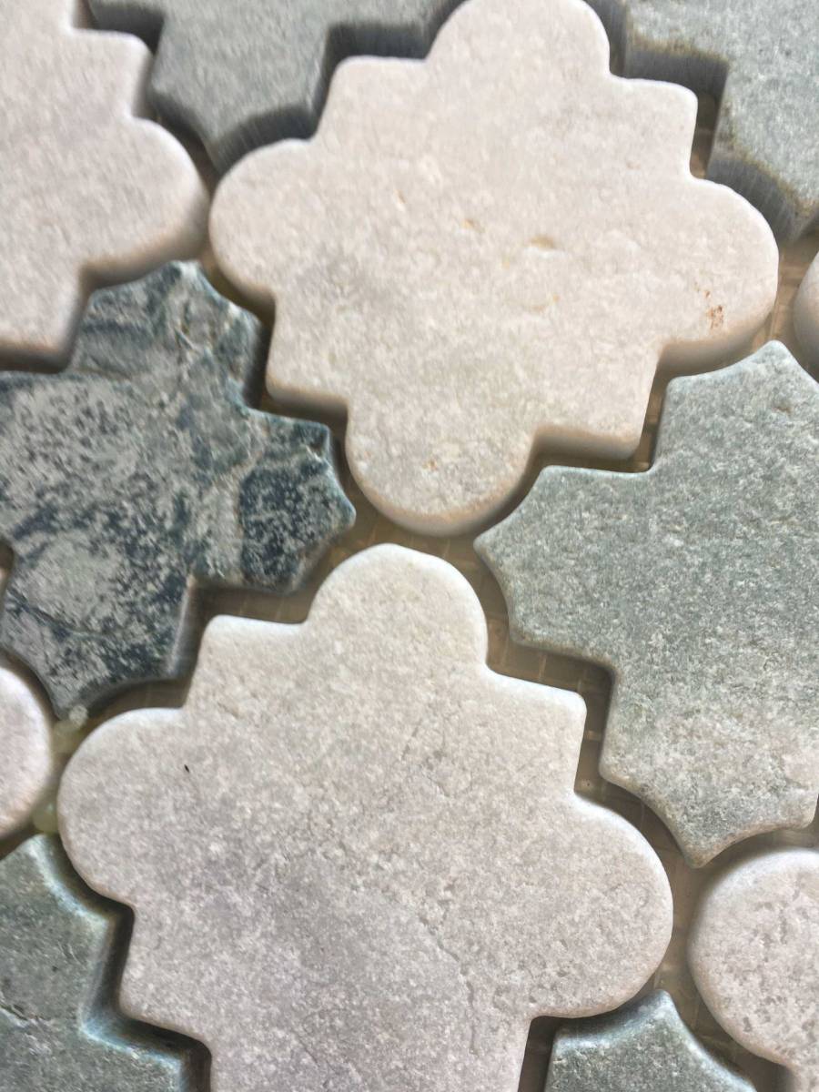 “The Cross Art collection is defined by its lucky clover silhouette. These natural stone mosaics feature a Cross and Star design with a tumbled edge that brings character and charm to any surface. They are an ideal choice for creating a textured, artistic statement on feature walls or floors.