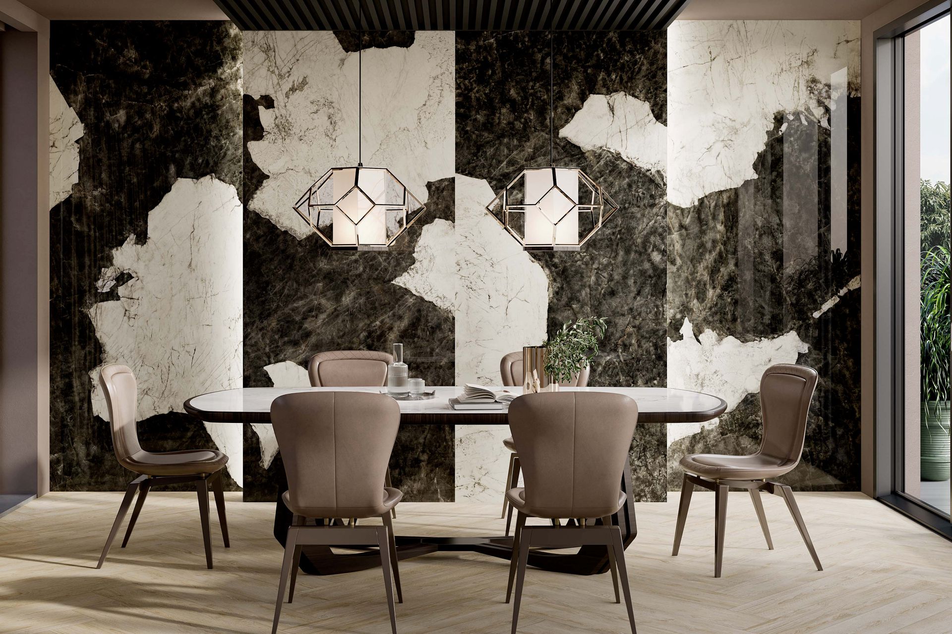 The Magma collection features a sophisticated porcelain slab format that replicates the raw, dramatic movement of natural stone with seamless precision. These large-format surfaces are ideal for wall and floor applications, providing a bold, high-impact finish for contemporary spaces.