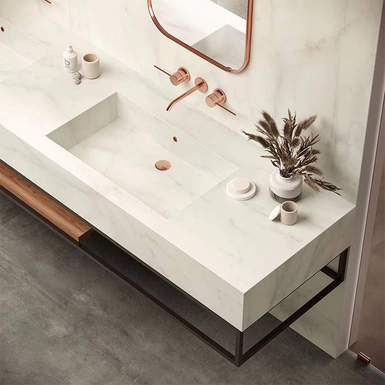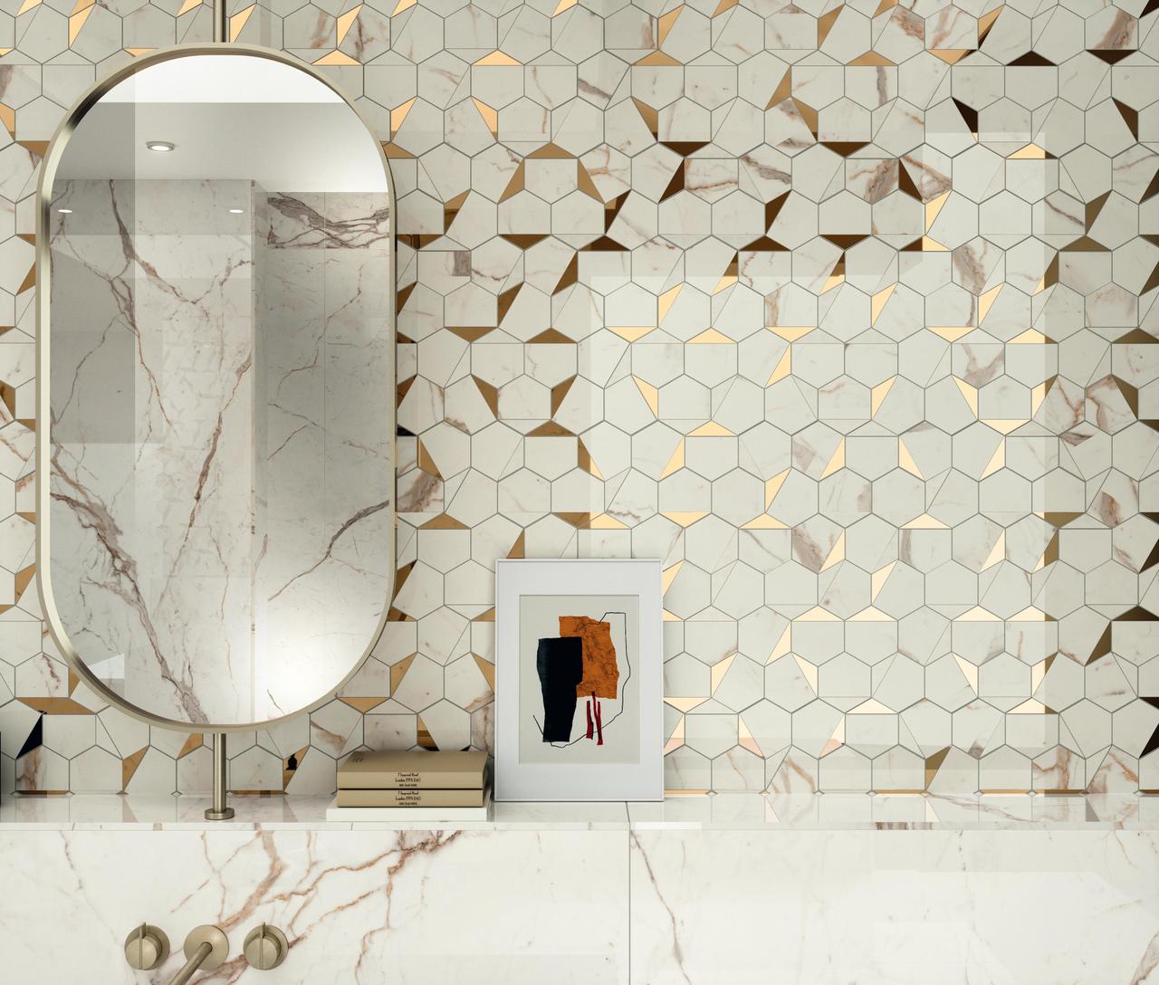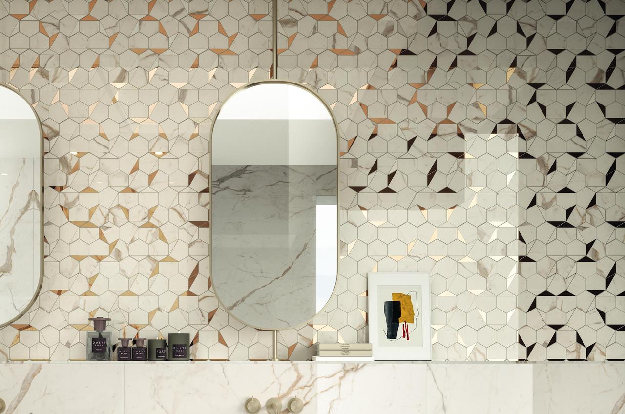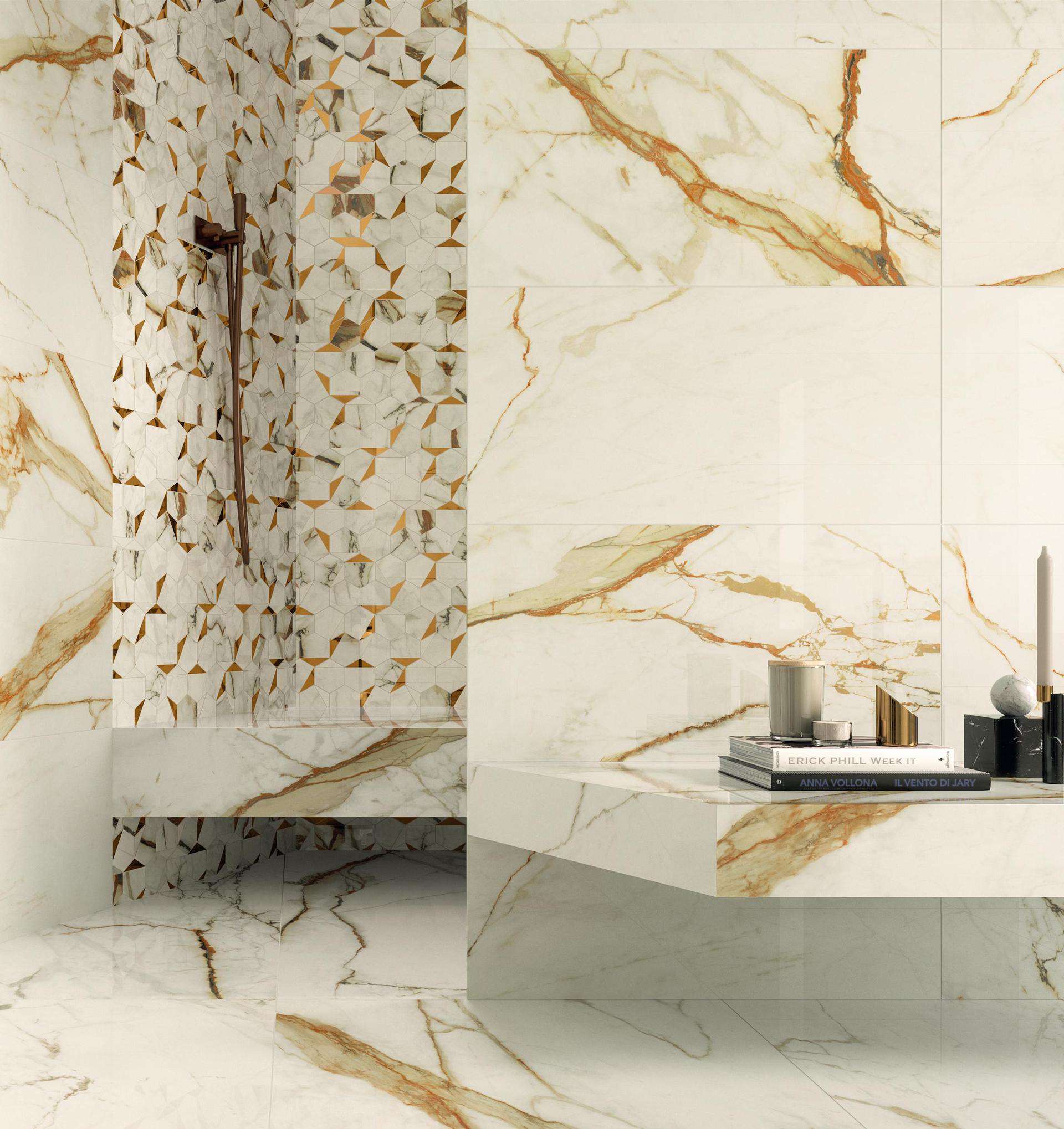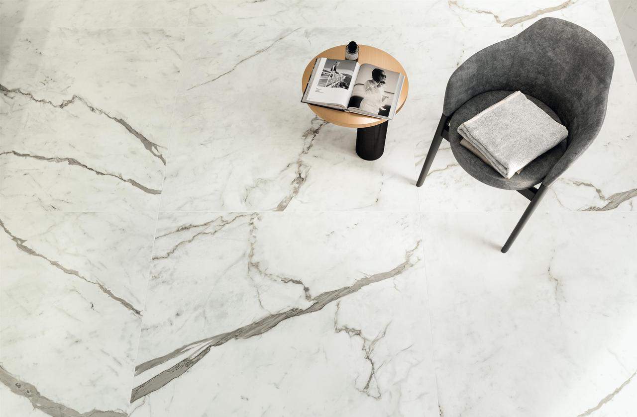 Four light tones inspired by the finest varieties of Calacatta and Statuario marbles and distinguished by a bright white background. The surface is traversed by warm or cool veins depending on the variety of marble, the total-white look enhancing applications on the wall, floor, and even on furnishings, not to mention combinations with other colours and accents of the Marvel collections. Variation is an inherent characteristic of tiles and stone.