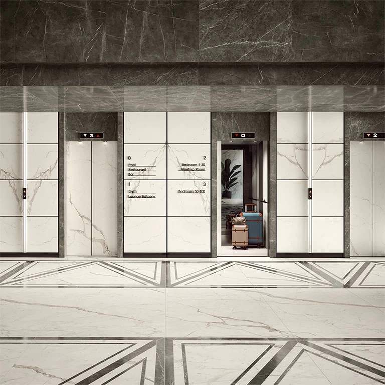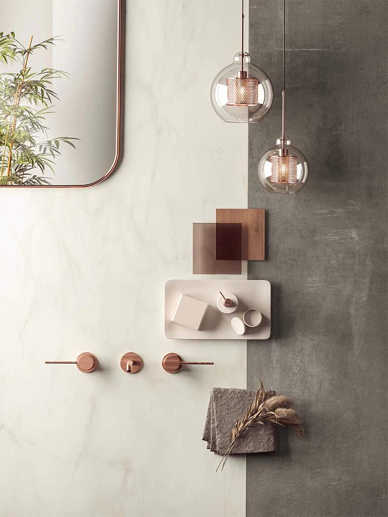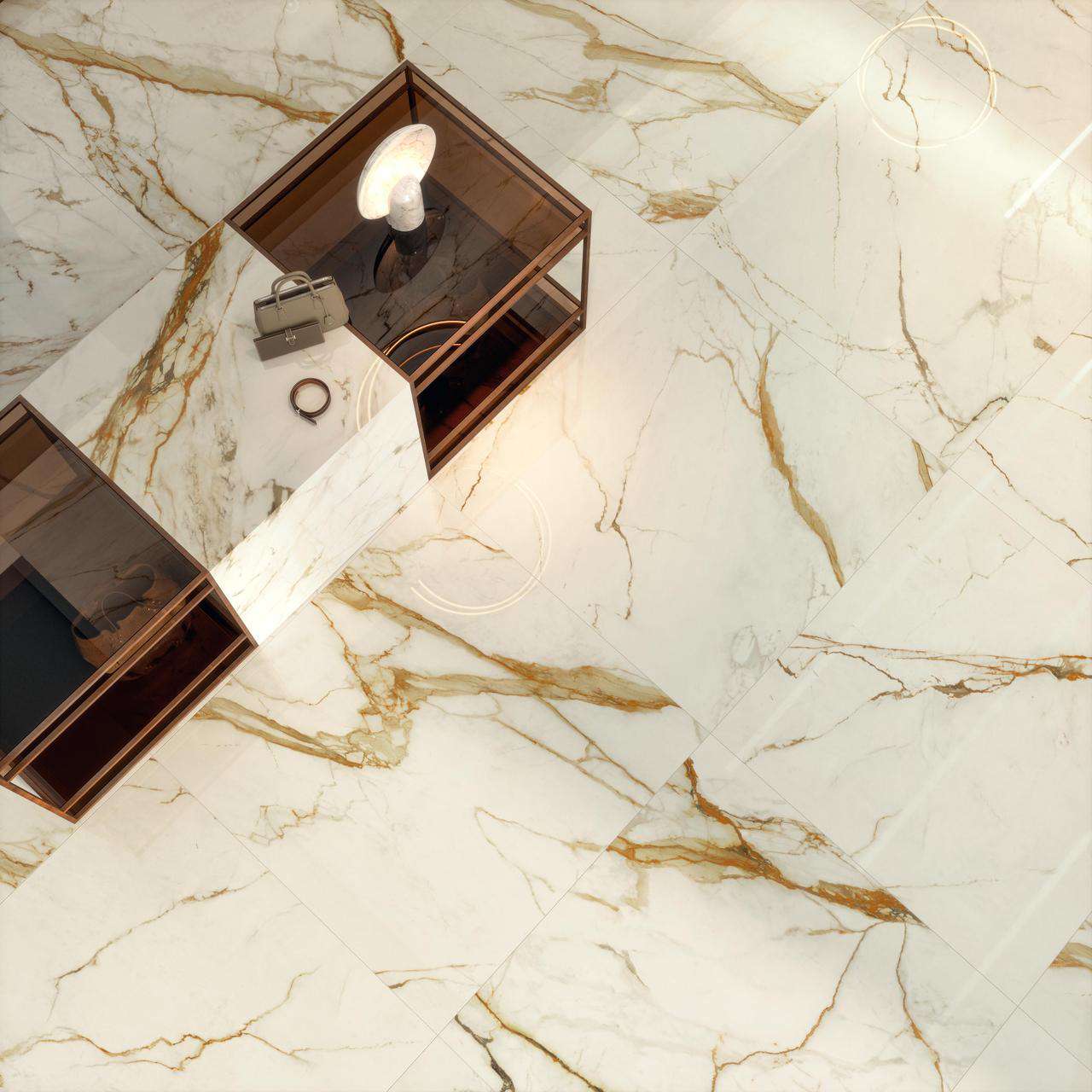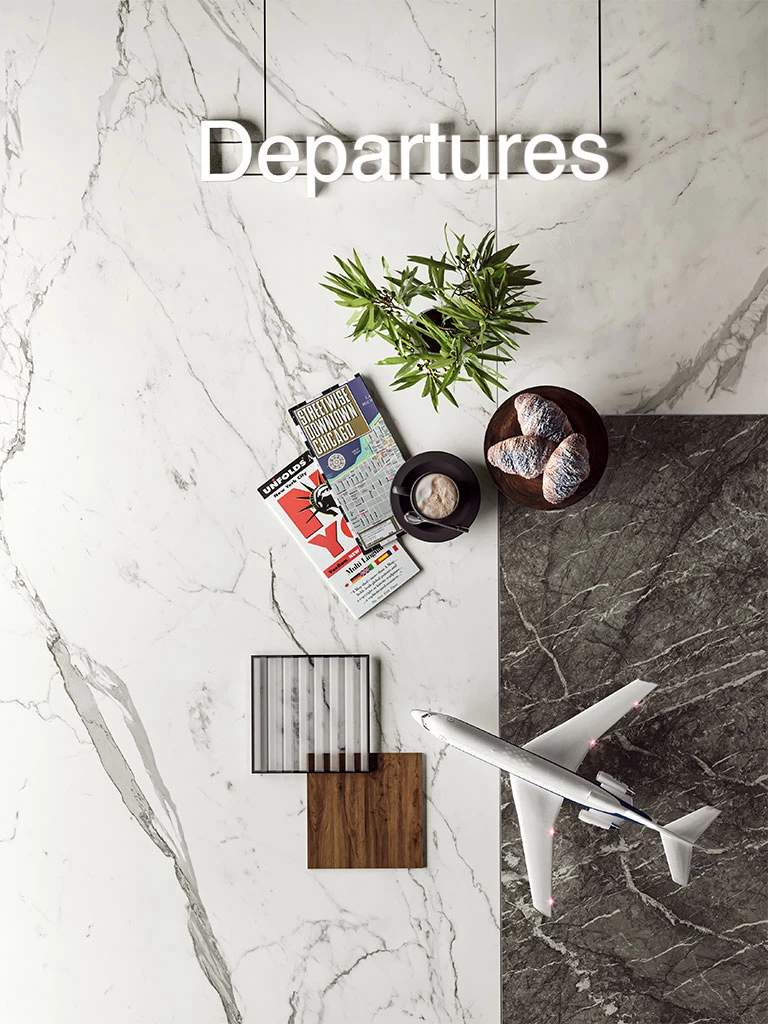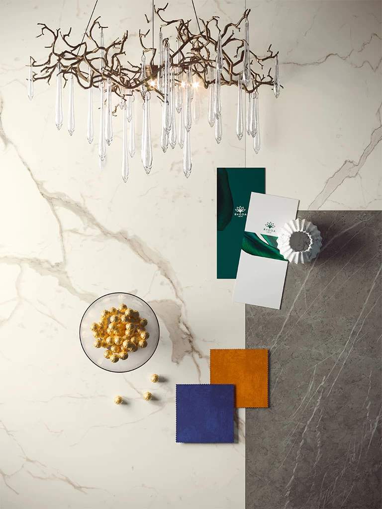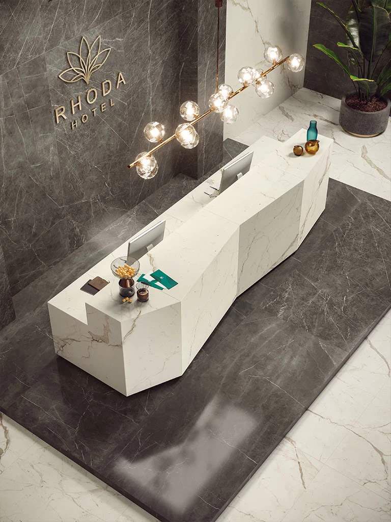 Four light tones inspired by the finest varieties of Calacatta and Statuario marbles and distinguished by a bright white background. The surface is traversed by warm or cool veins depending on the variety of marble, the total-white look enhancing applications on the wall, floor, and even on furnishings, not to mention combinations with other colours and accents of the Marvel collections. Variation is an inherent characteristic of tiles and stone.
