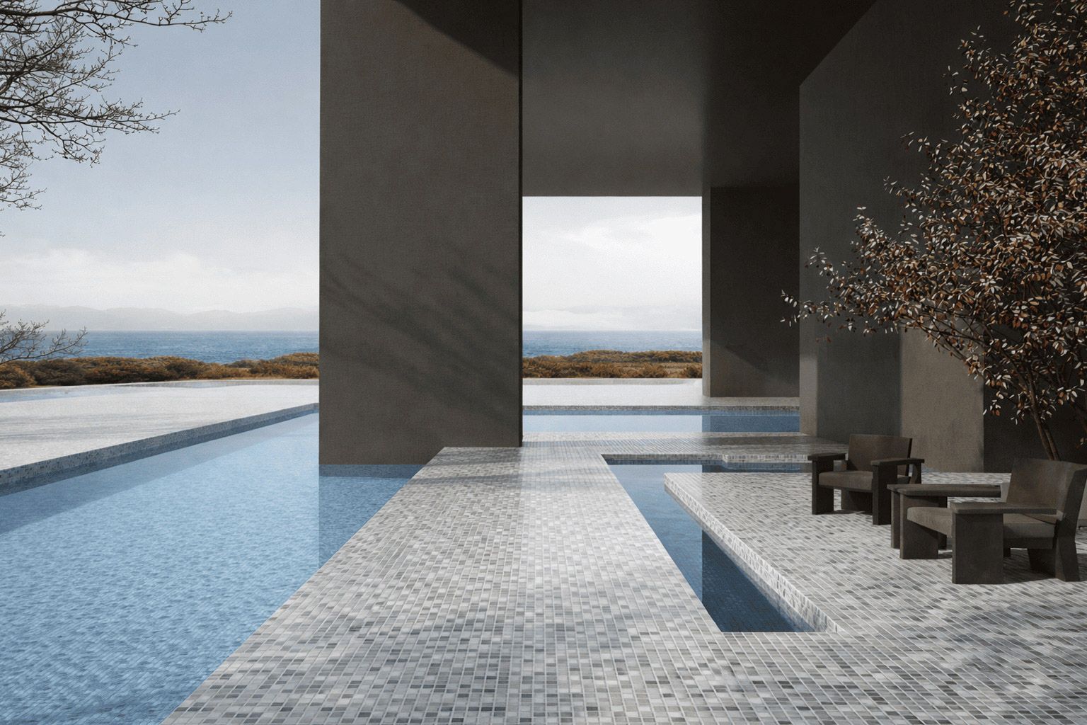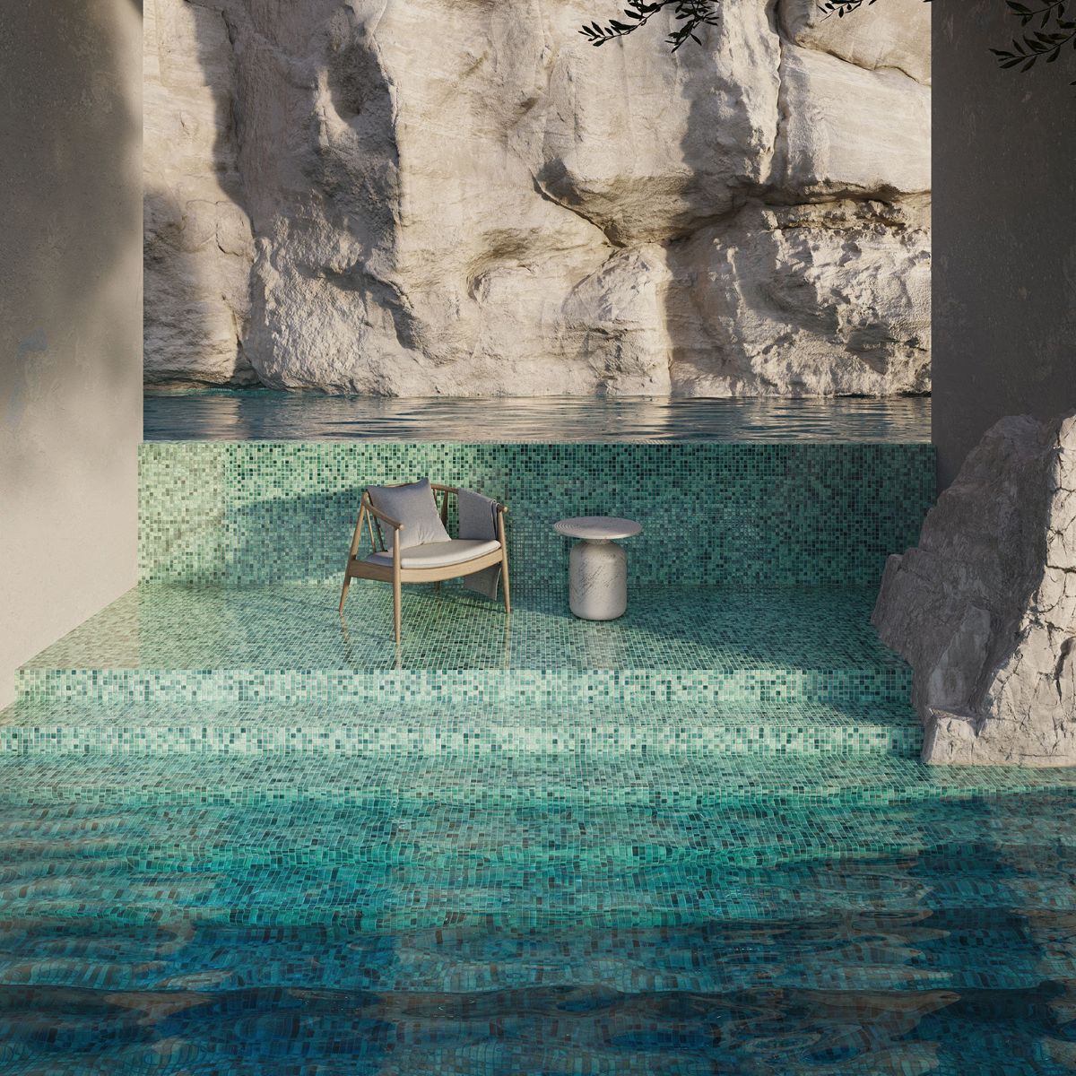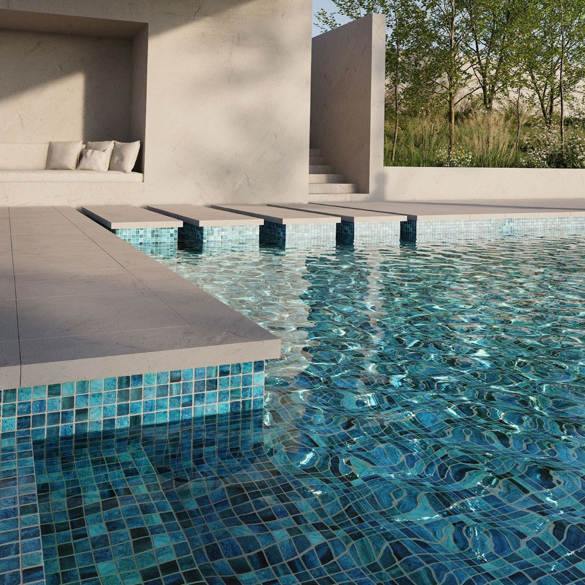 Grey mosaics: Give the water greyish tones with elegant blue or green hues, ideal for a modern and urban aesthetic.