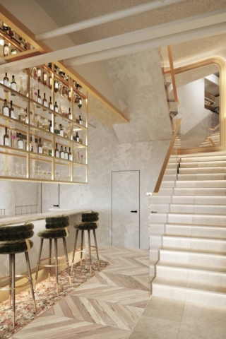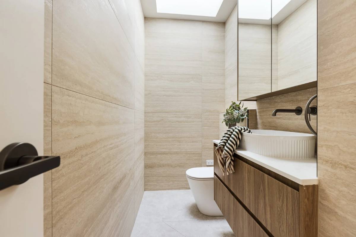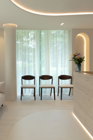 Designed for a premium wellness experience, this commercial interior utilises vein-cut travertine-look porcelain to evoke a sense of...