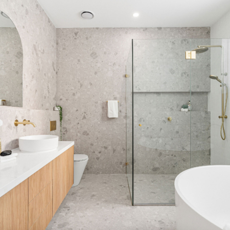 The Pagewood Project features Maestro Moon, a stone‑look porcelain tile with soft, silvery‑grey tones that...