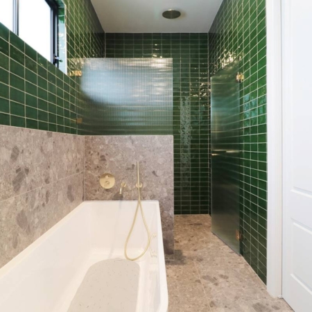 This space is an exercise in soft minimalism, pairing matte stone tiles with handmade-look splashbacks for a subtle,...