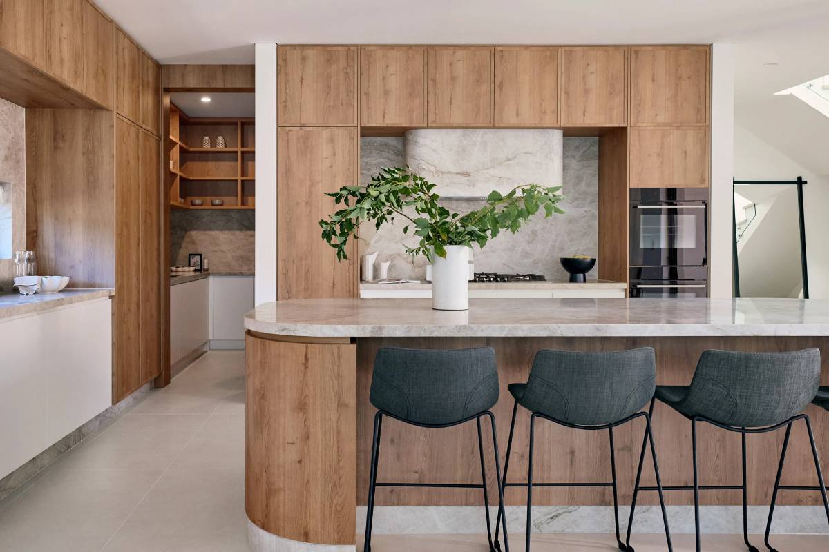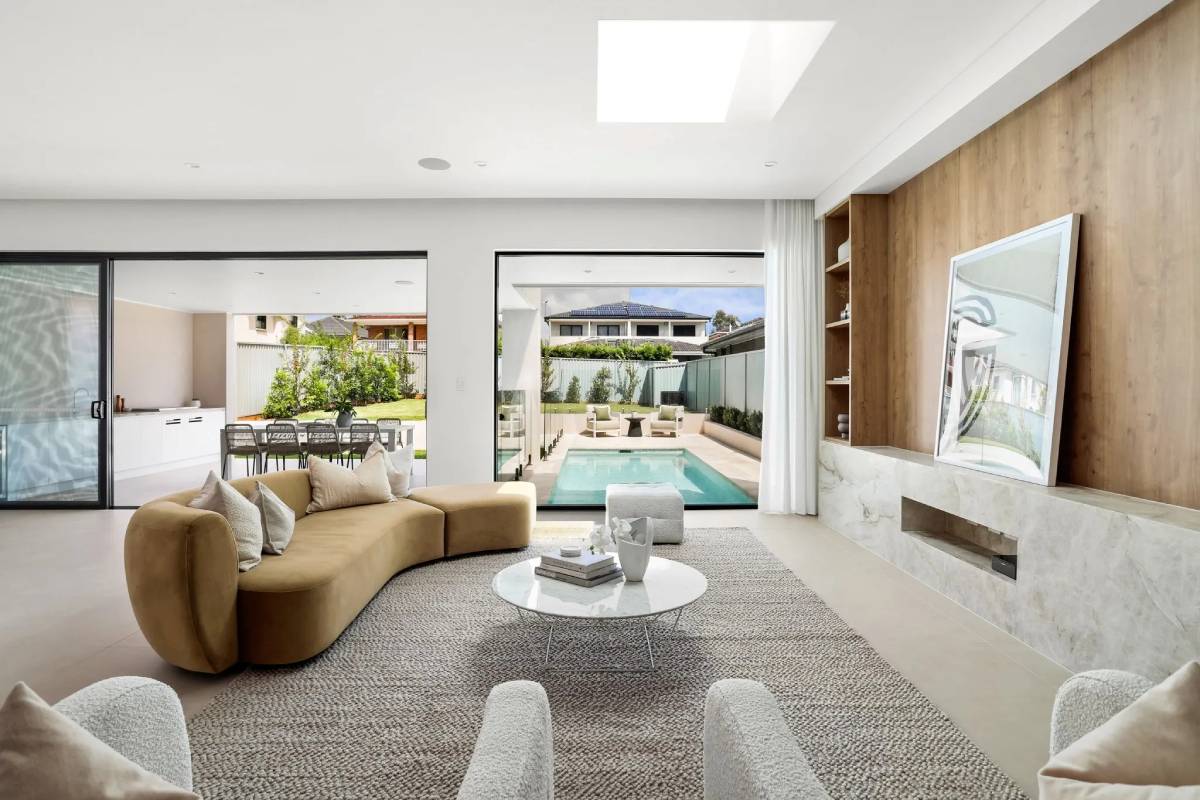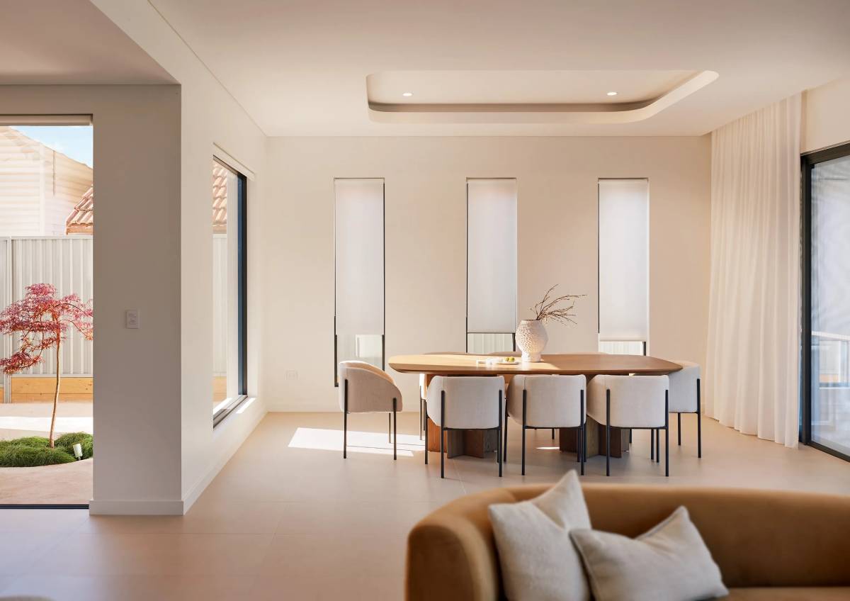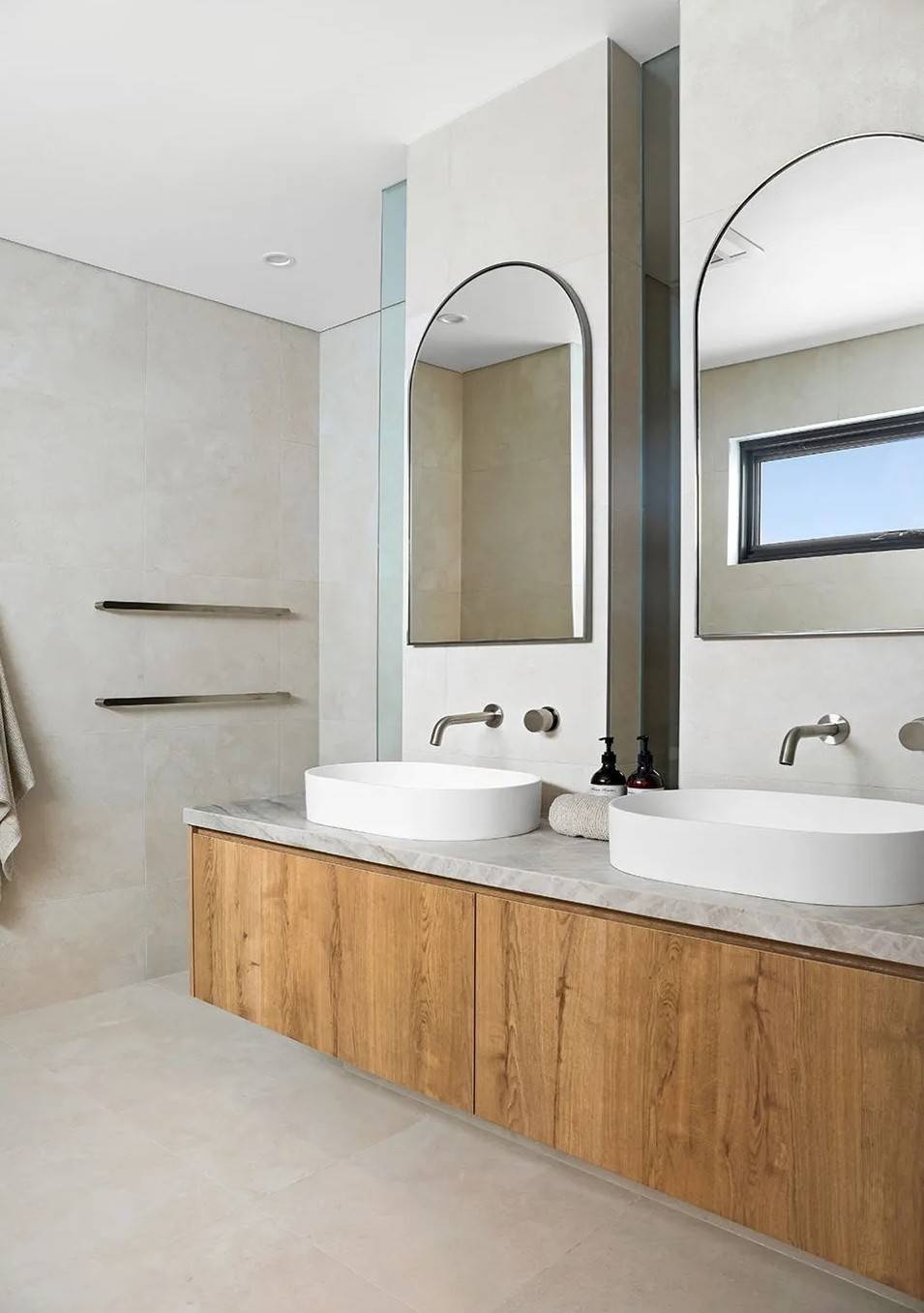 This space demonstrates a sophisticated industrial-modern aesthetic, anchored by large-format concrete-look tiles that provide a seamless, expansive foundation. The cool grey tones are thoughtfully balanced with warm timber joinery and soft lighting, creating a high-end atmosphere that feels both expansive and inviting.