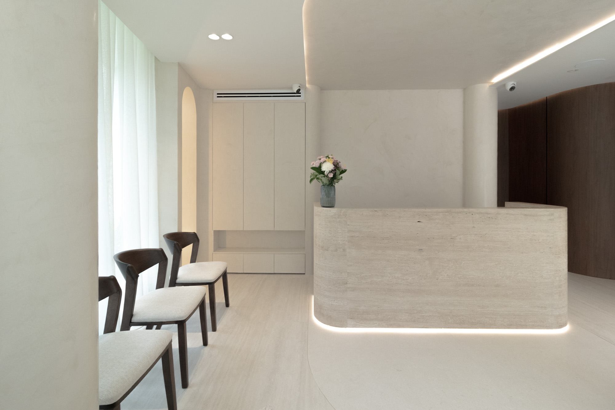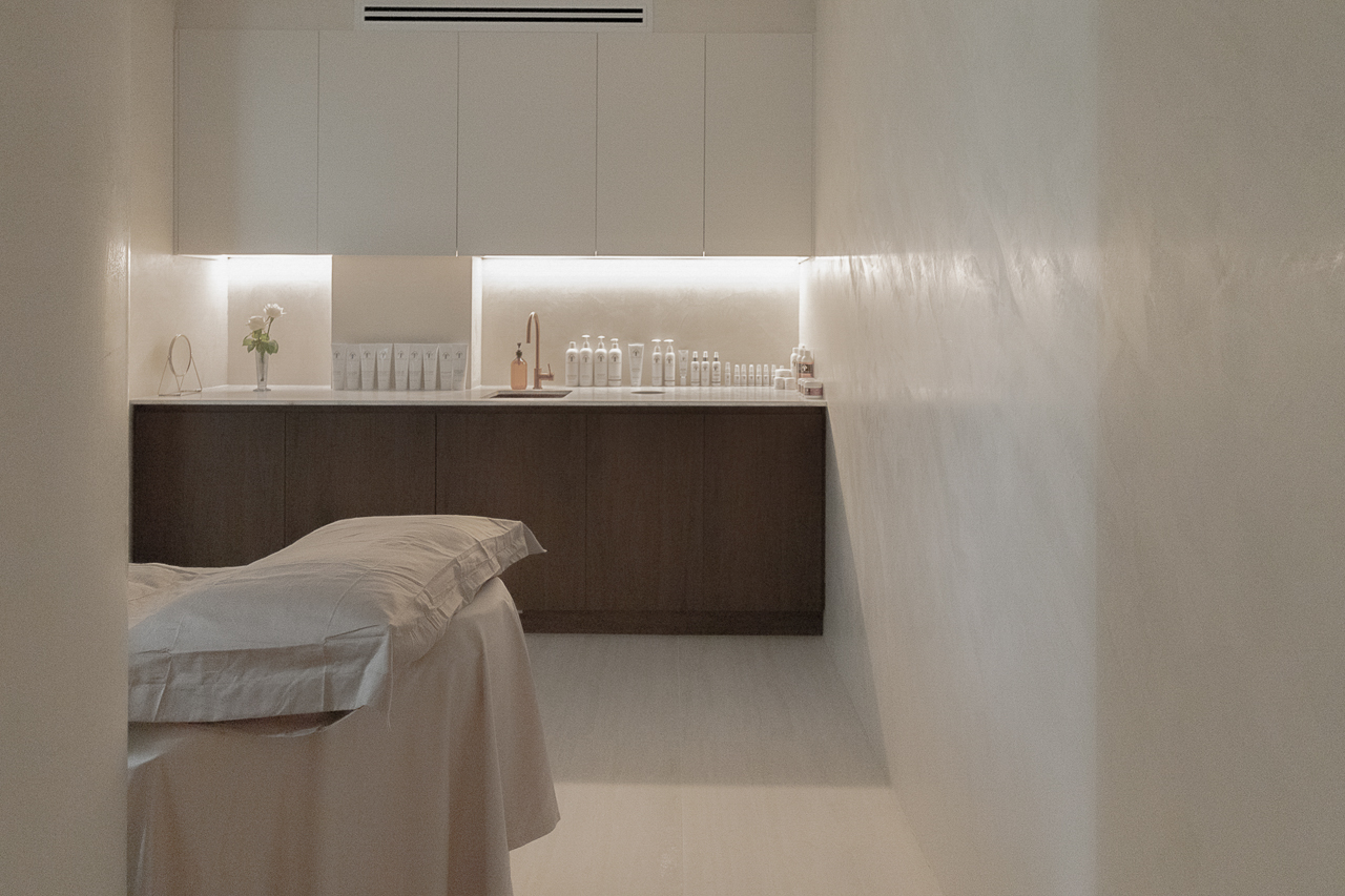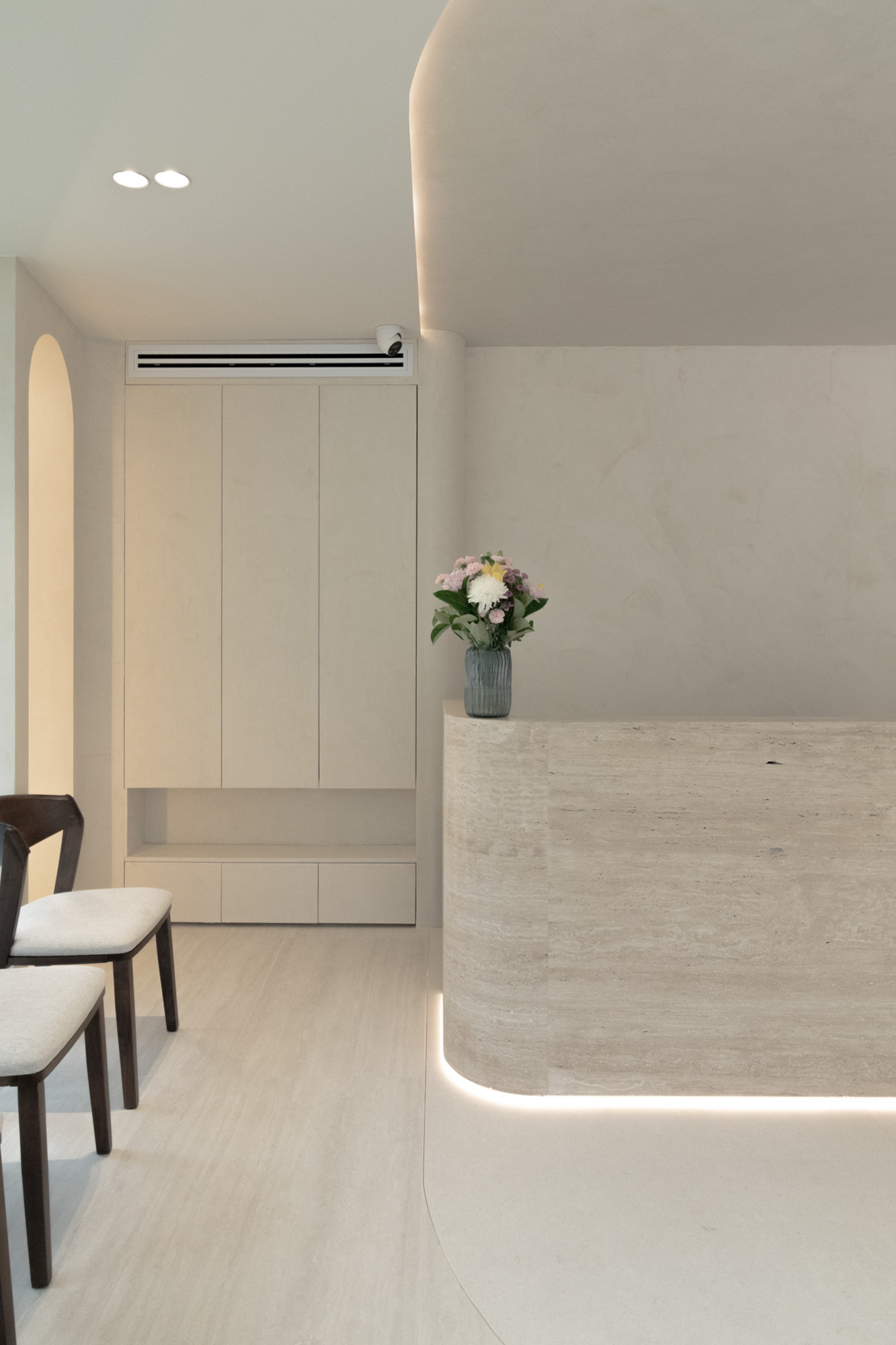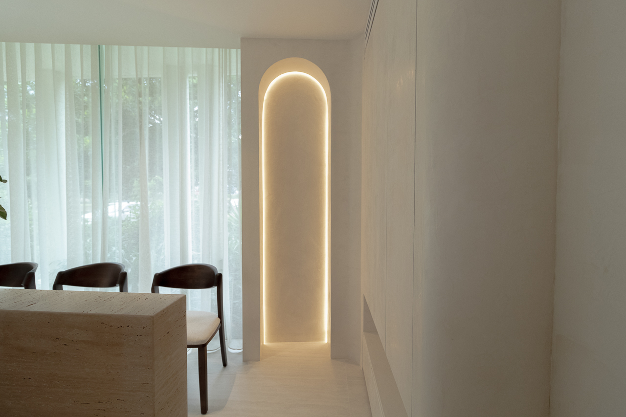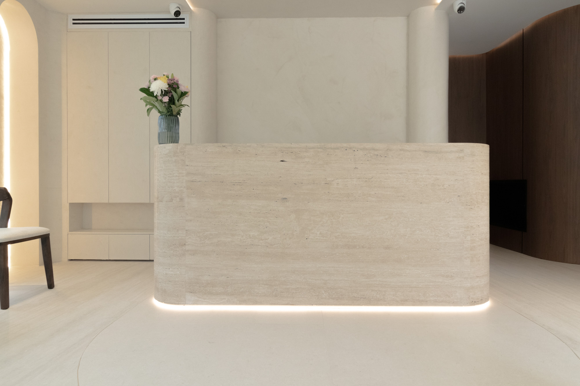 Designed for a premium wellness experience, this commercial interior utilises vein-cut travertine-look porcelain to evoke a sense of organic serenity and professional clinical excellence. The 3D textures and large-format limestone-inspired tiles create a seamless, monolithic appearance that enlarges the space while maintaining a soft, tactile quality. The neutral, “bone” and “bianco” colour palette reflects light beautifully, emphasising a clean, high-end aesthetic suitable for a boutique spa environment.