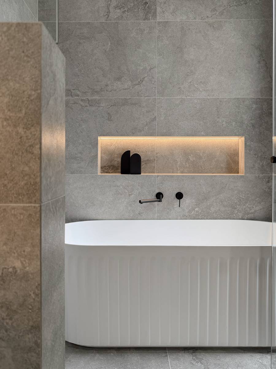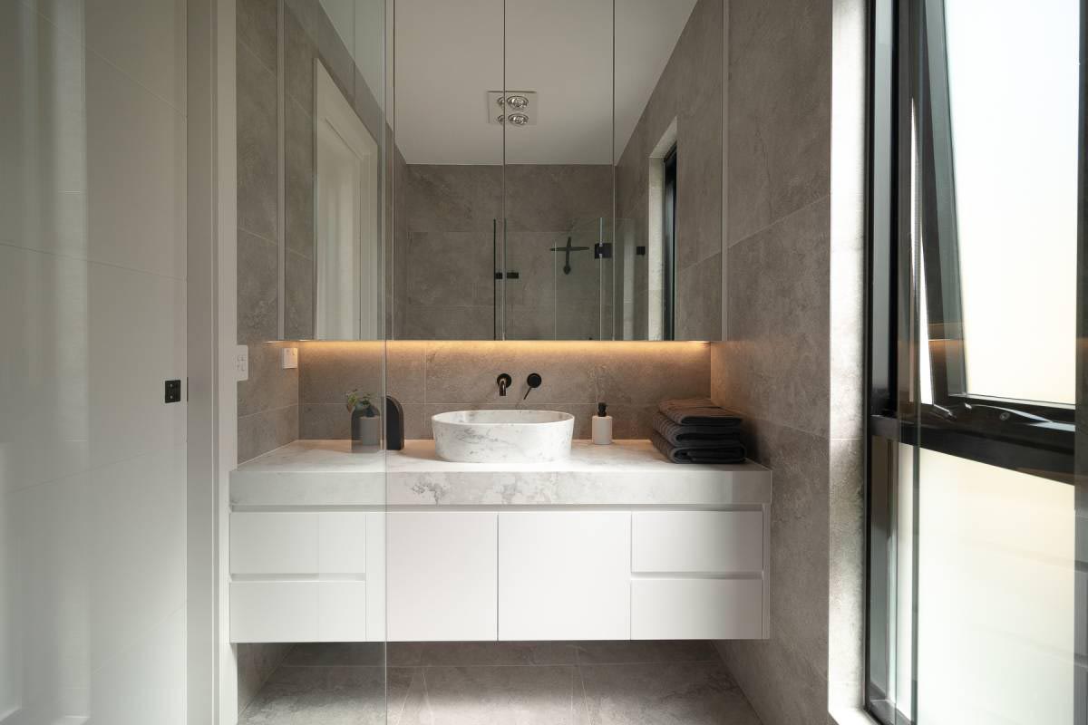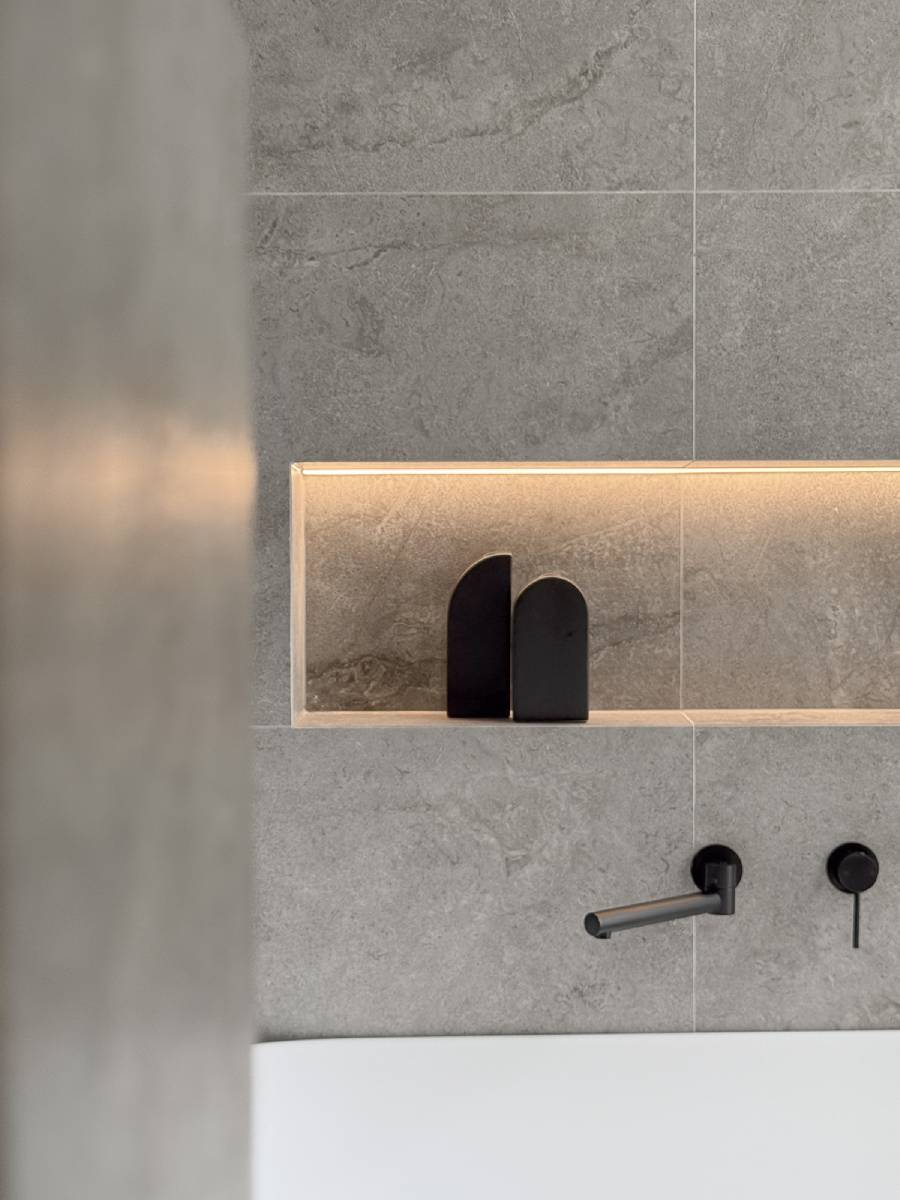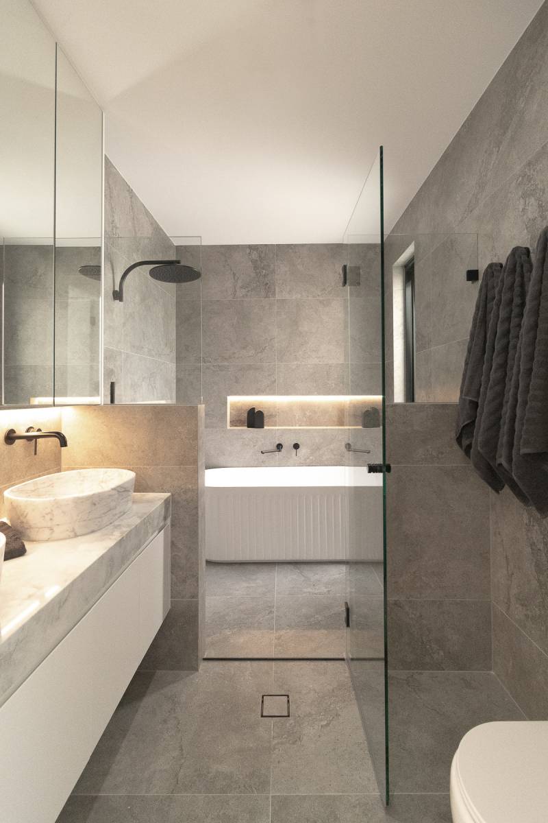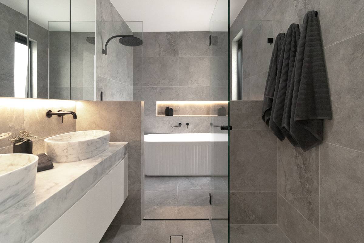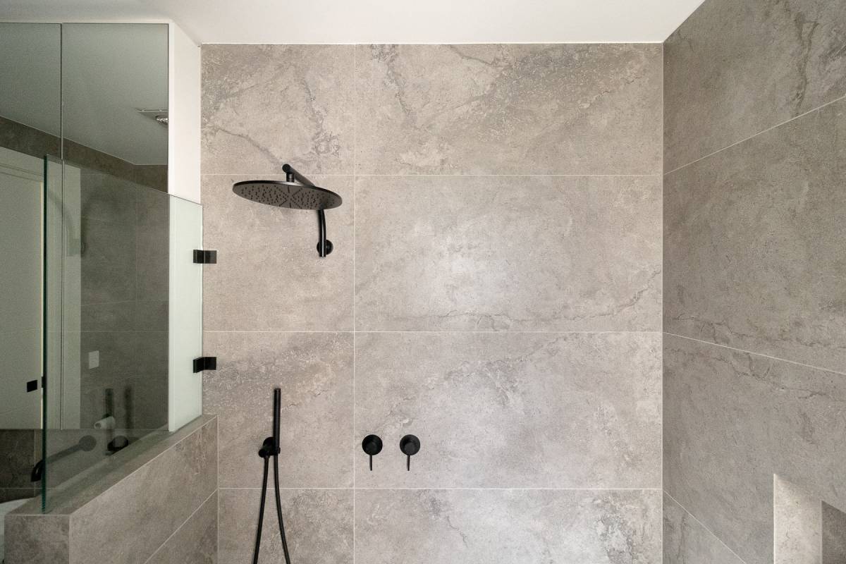 Defined by its robust yet elegant character, this project features porcelain tiles that harmonise perfectly with rugged natural stone cladding. The design prioritises a strong connection to the outdoors, using In&Out tile technology to create a unified floor plane that enhances the home’s earthy grey colour palette.