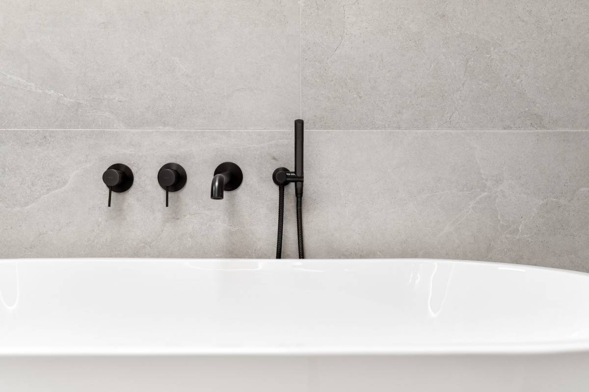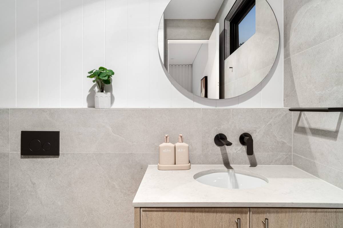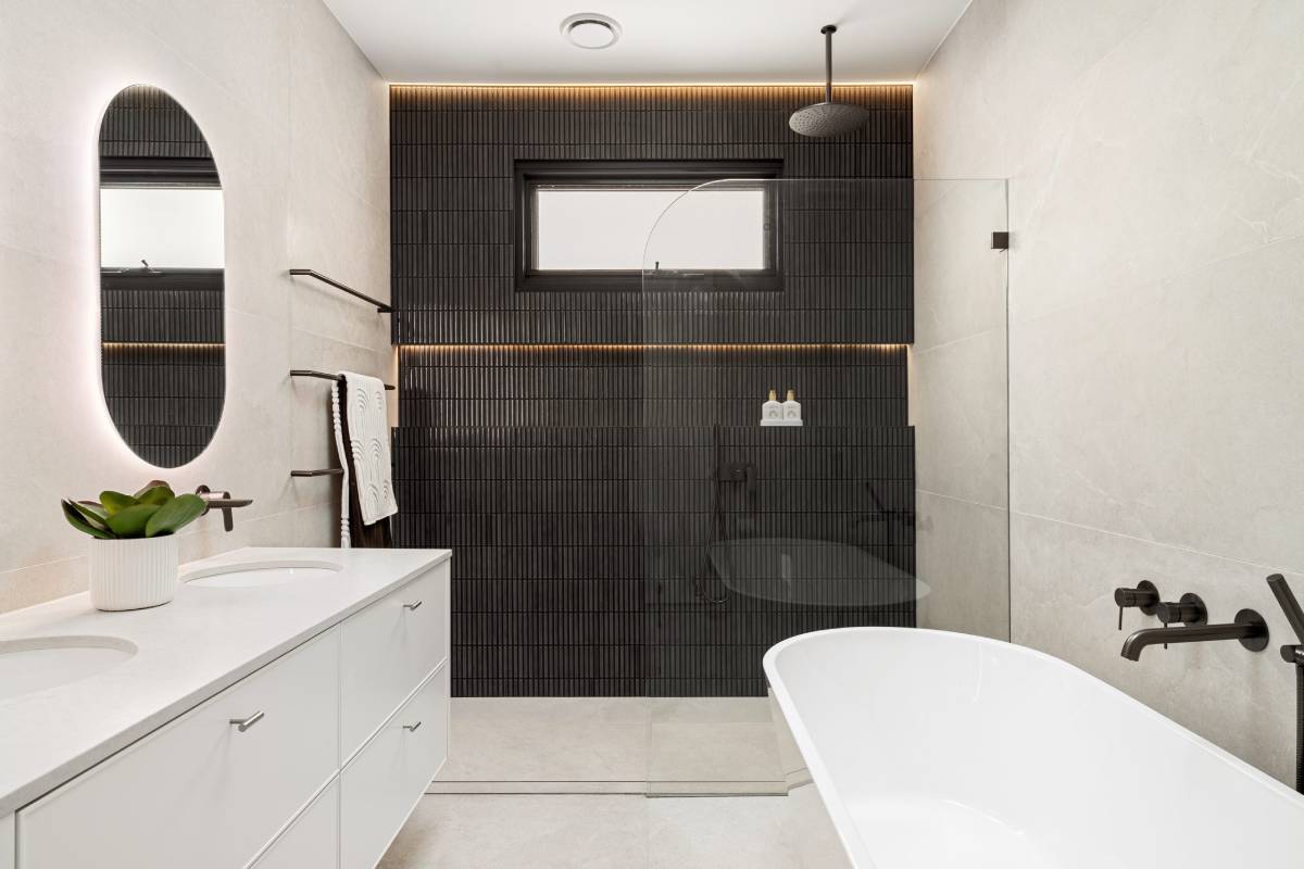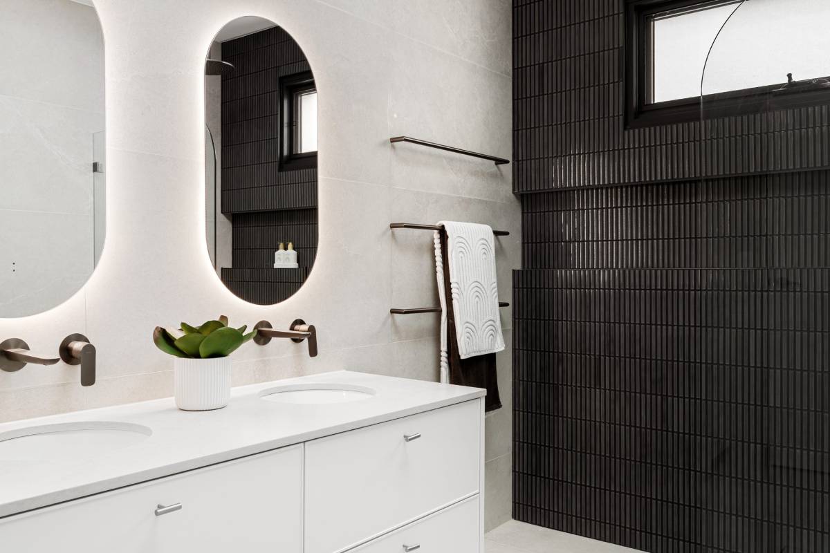 The Pagewood Project features Maestro Moon, a stone‑look porcelain tile with soft, silvery‑grey tones that create a calm, contemporary canvas underfoot and across key interior surfaces, giving the space a refined yet natural feel. Paired with Rakeen Concave Dark Grey mosaic tiles, their rich, dark grey gloss adds depth and subtle texture, offering a sophisticated contrast that elevates wall features and accents throughout the design. Together, these tiles balance serene neutral flooring with dynamic dark‑grey detailing, resulting in a cohesive palette that feels both modern and timeless.
