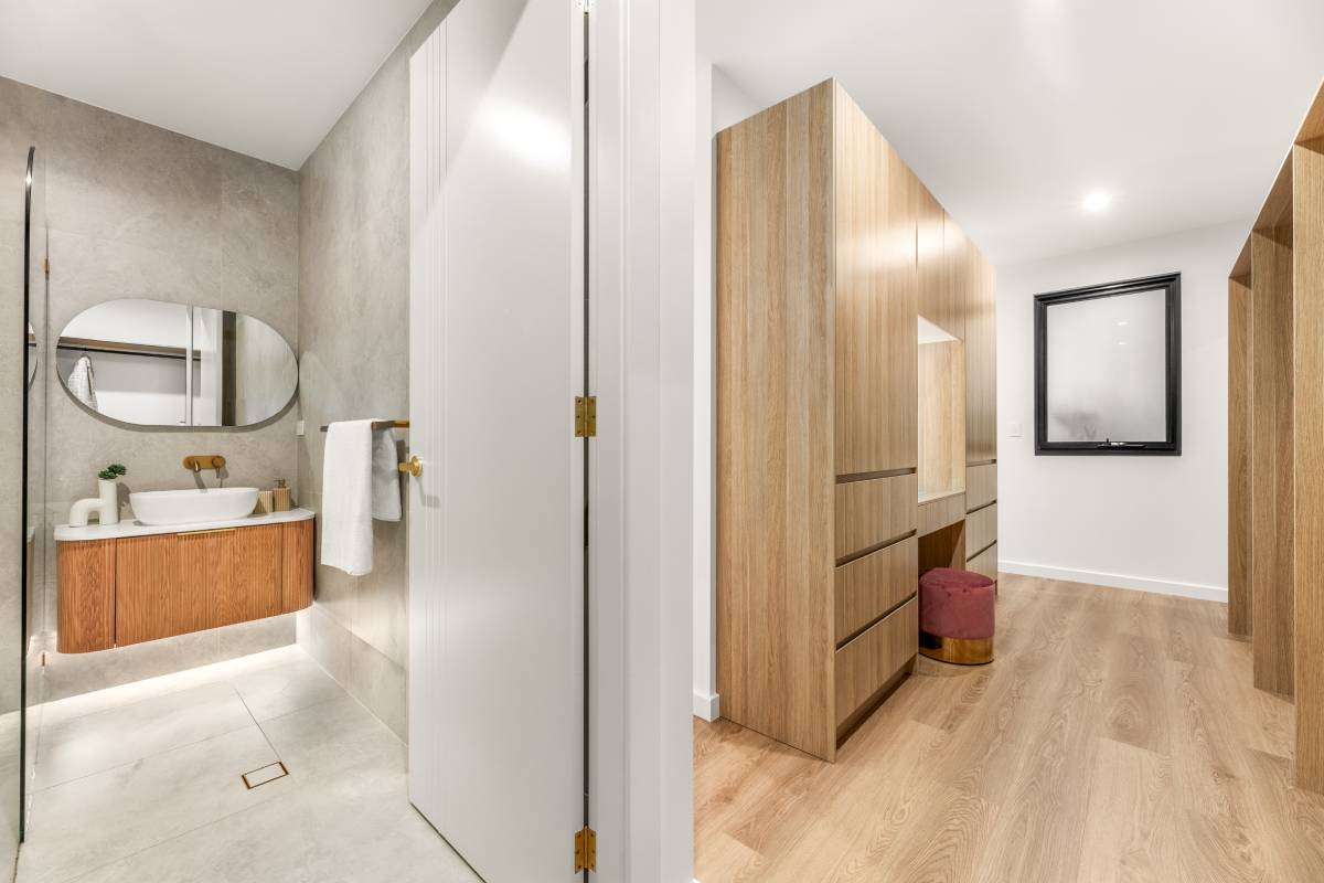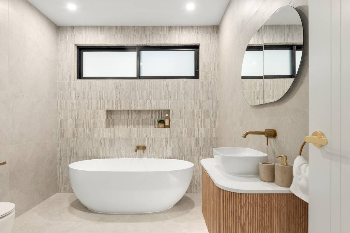 A striking exercise in contrast, this project pairs deep charcoal flooring with crisp white wall tiles for a high-impact architectural statement. The precision of the grout-work and the selection of premium porcelain reflect a commitment to the fine craftsmanship expected in luxury builds.