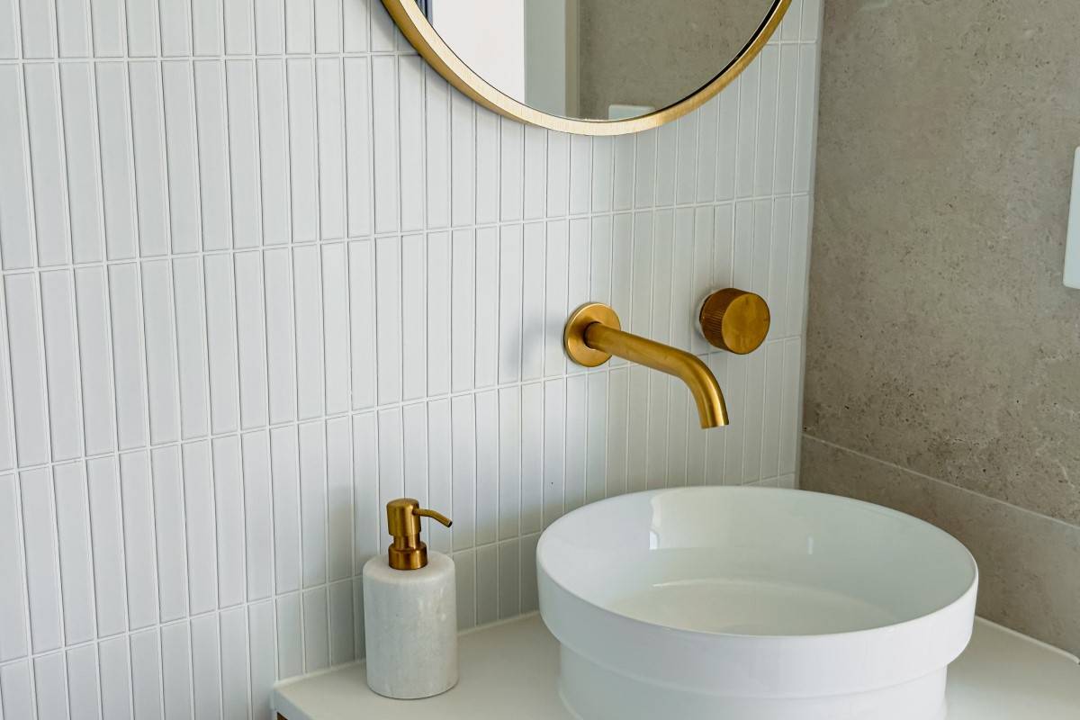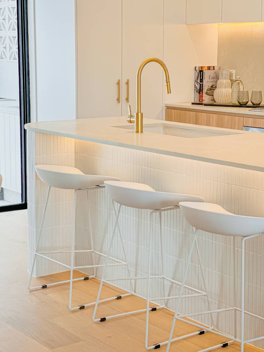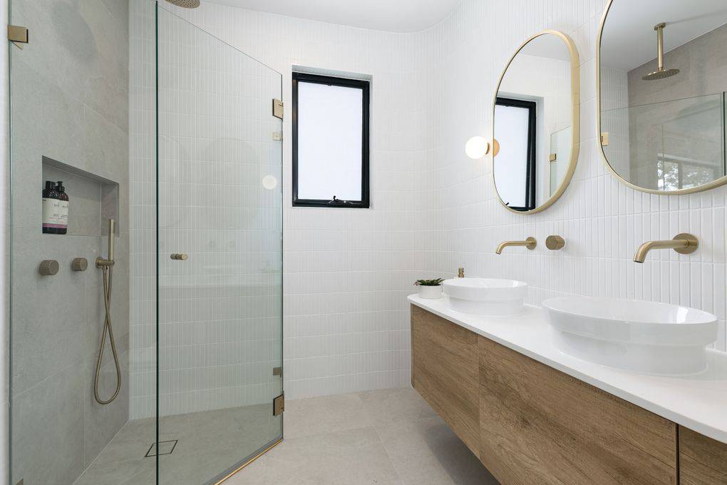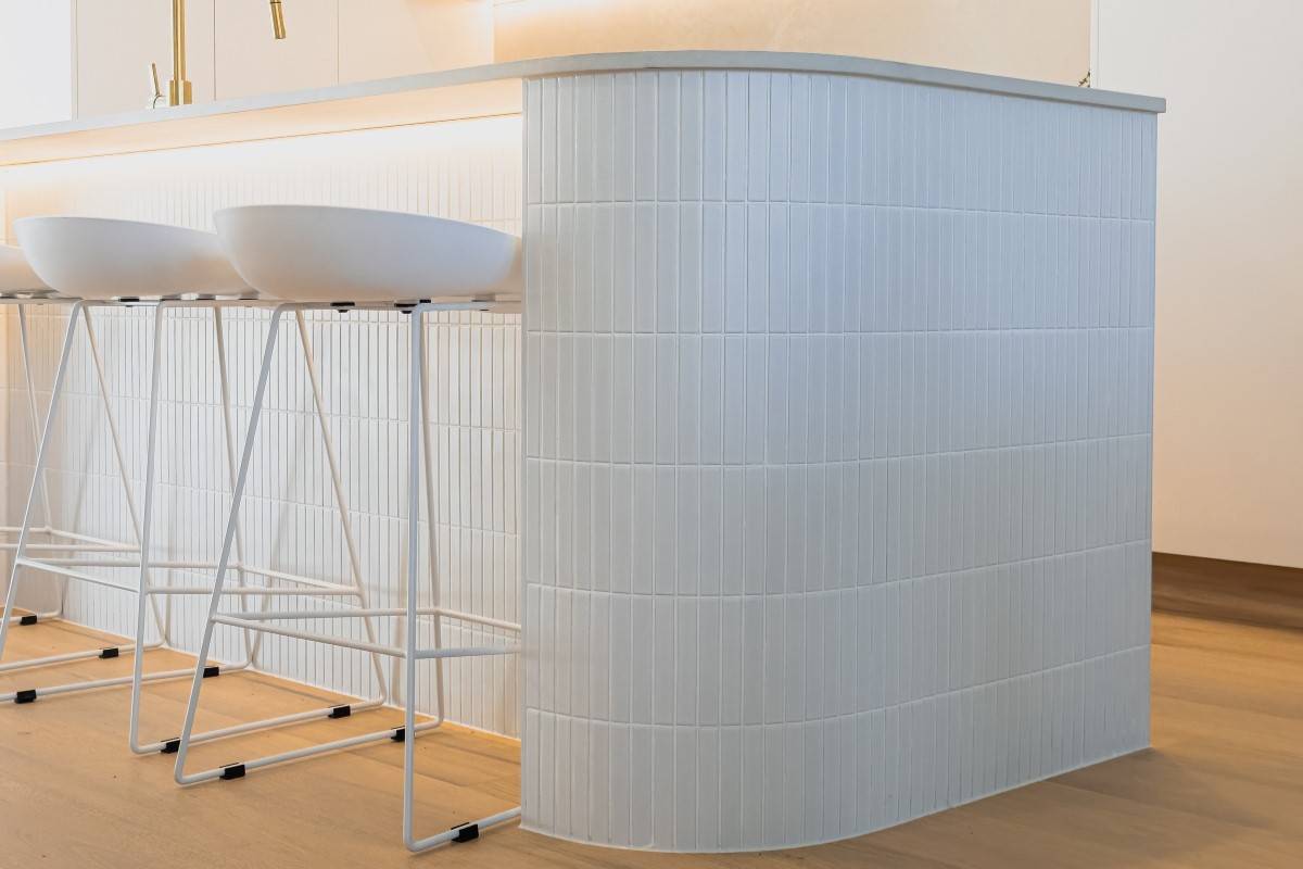 Defined by a coastal luxury palette, this design features Fraser Bianco stone-look tiles complemented by delicate White Matt Kit Kat mosaics. The transition to Maestro Cinder Crazy Pave in the outdoor zones creates a harmonious flow, blending clean architectural lines with raw, natural textures.