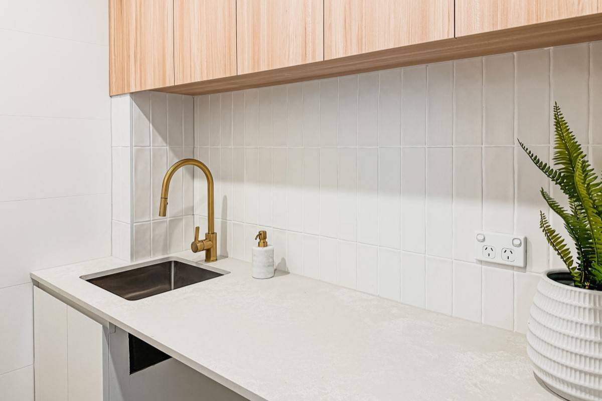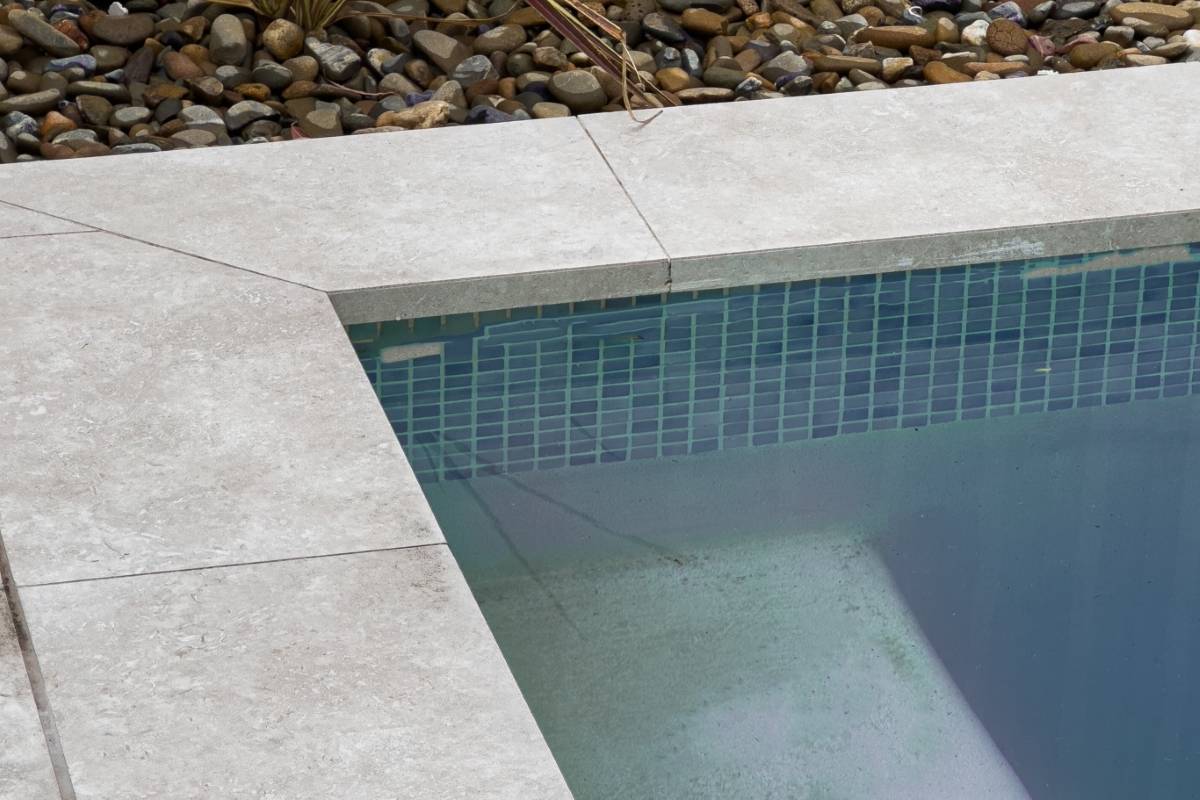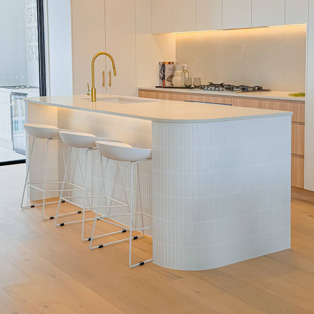 Defined by a coastal luxury palette, this design features Fraser Bianco stone-look tiles complemented by delicate White Matt Kit Kat mosaics. The transition to Maestro Cinder Crazy Pave in the outdoor zones creates a harmonious flow, blending clean architectural lines with raw, natural textures.