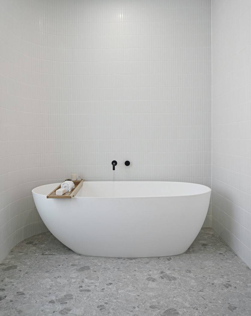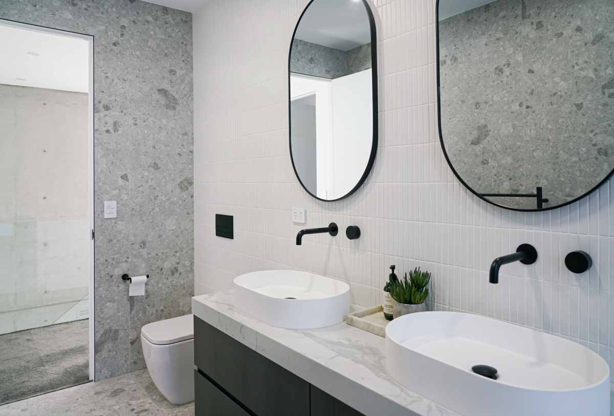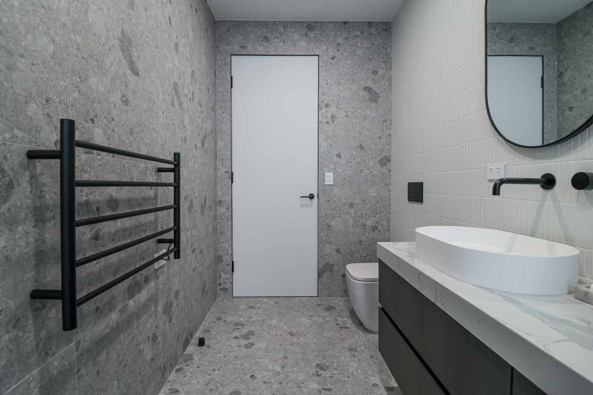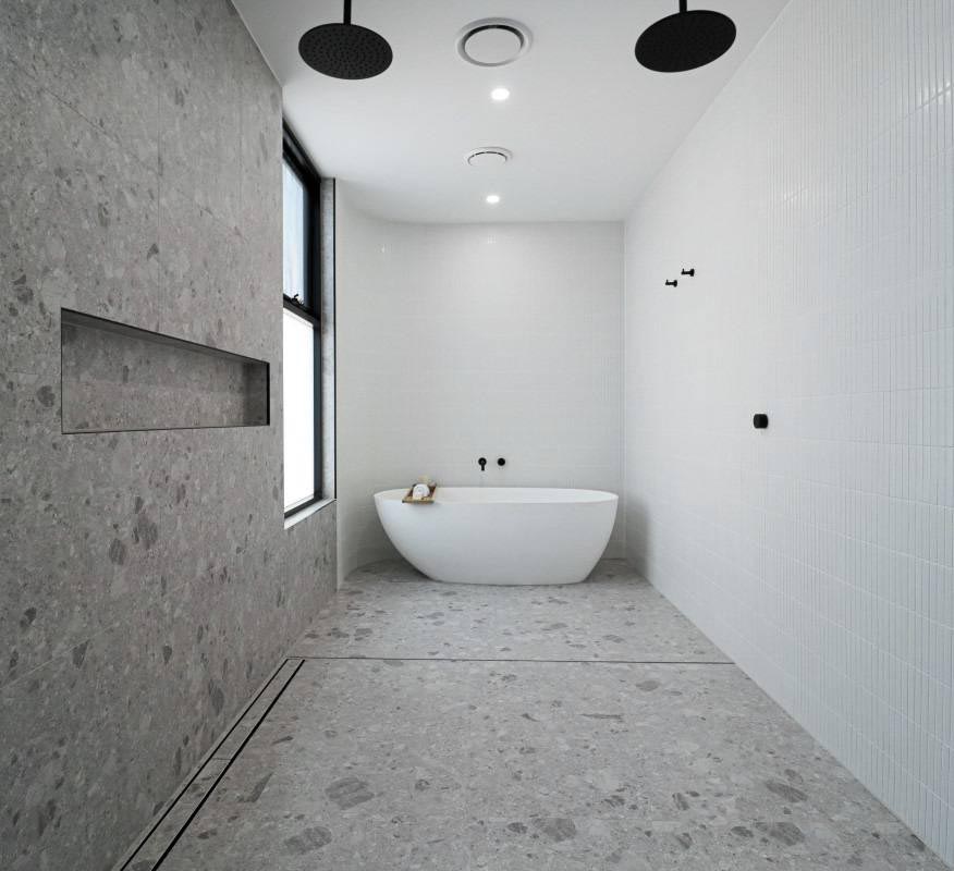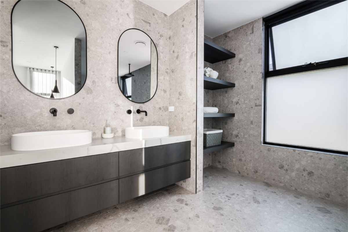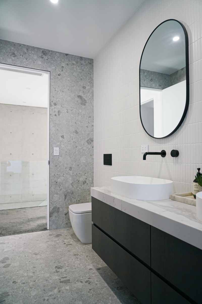 This project beautifully harmonises texture and tone by pairing Kit Kat White Matt mosaics with the robust character of Big Rock Terrazzo Light Grey. The bathroom and laundry spaces utilise these tactile surfaces to achieve a modern, organic aesthetic, while the Ceppo Light Matt and Layla Miami selections ensure a seamless transition for outdoor architectural tiling.