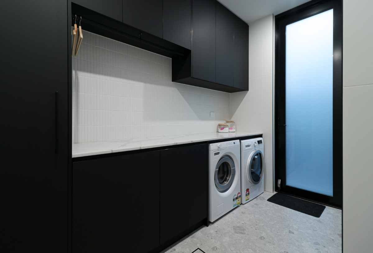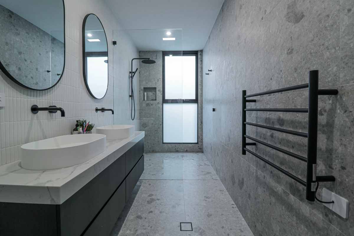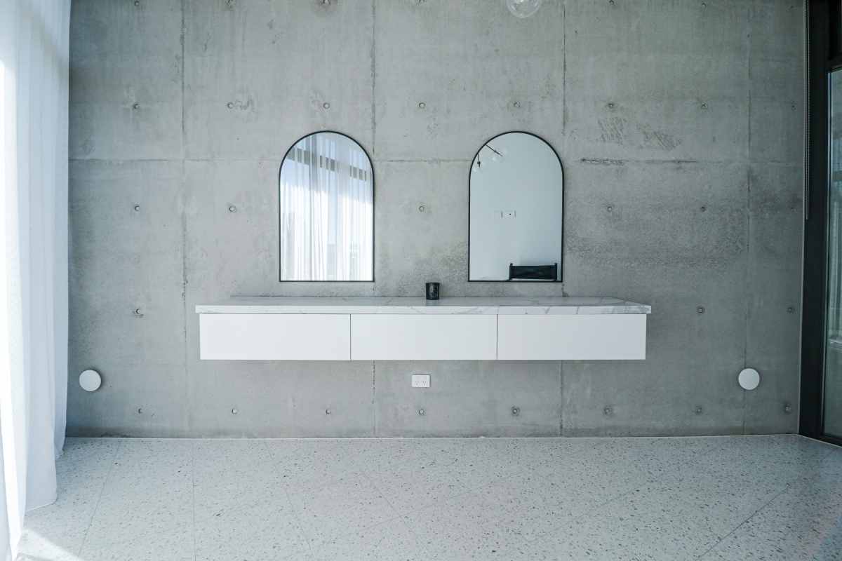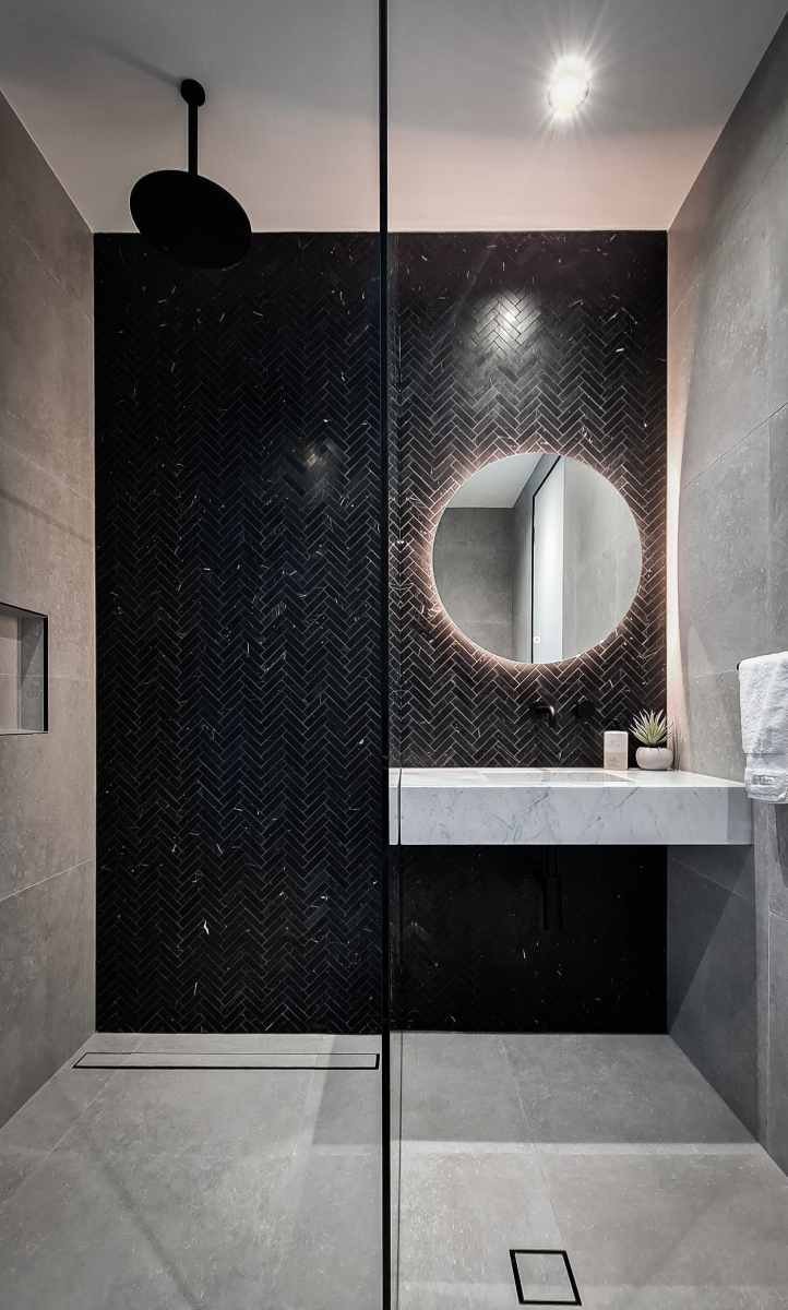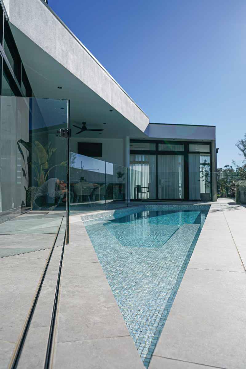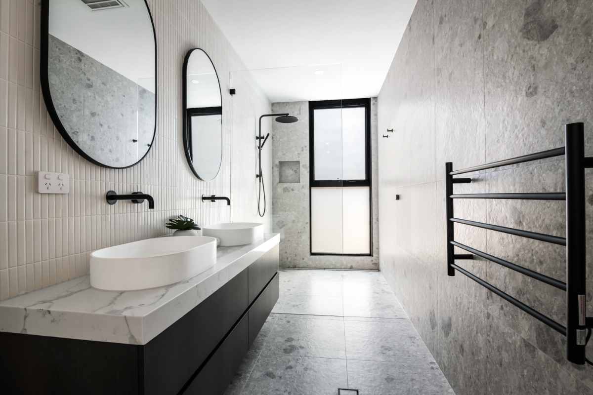 This project beautifully harmonises texture and tone by pairing Kit Kat White Matt mosaics with the robust character of Big Rock Terrazzo Light Grey. The bathroom and laundry spaces utilise these tactile surfaces to achieve a modern, organic aesthetic, while the Ceppo Light Matt and Layla Miami selections ensure a seamless transition for outdoor architectural tiling.