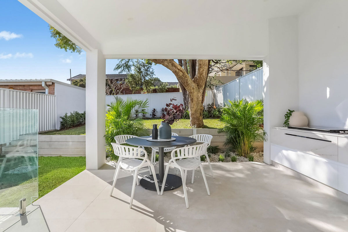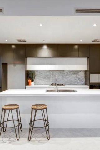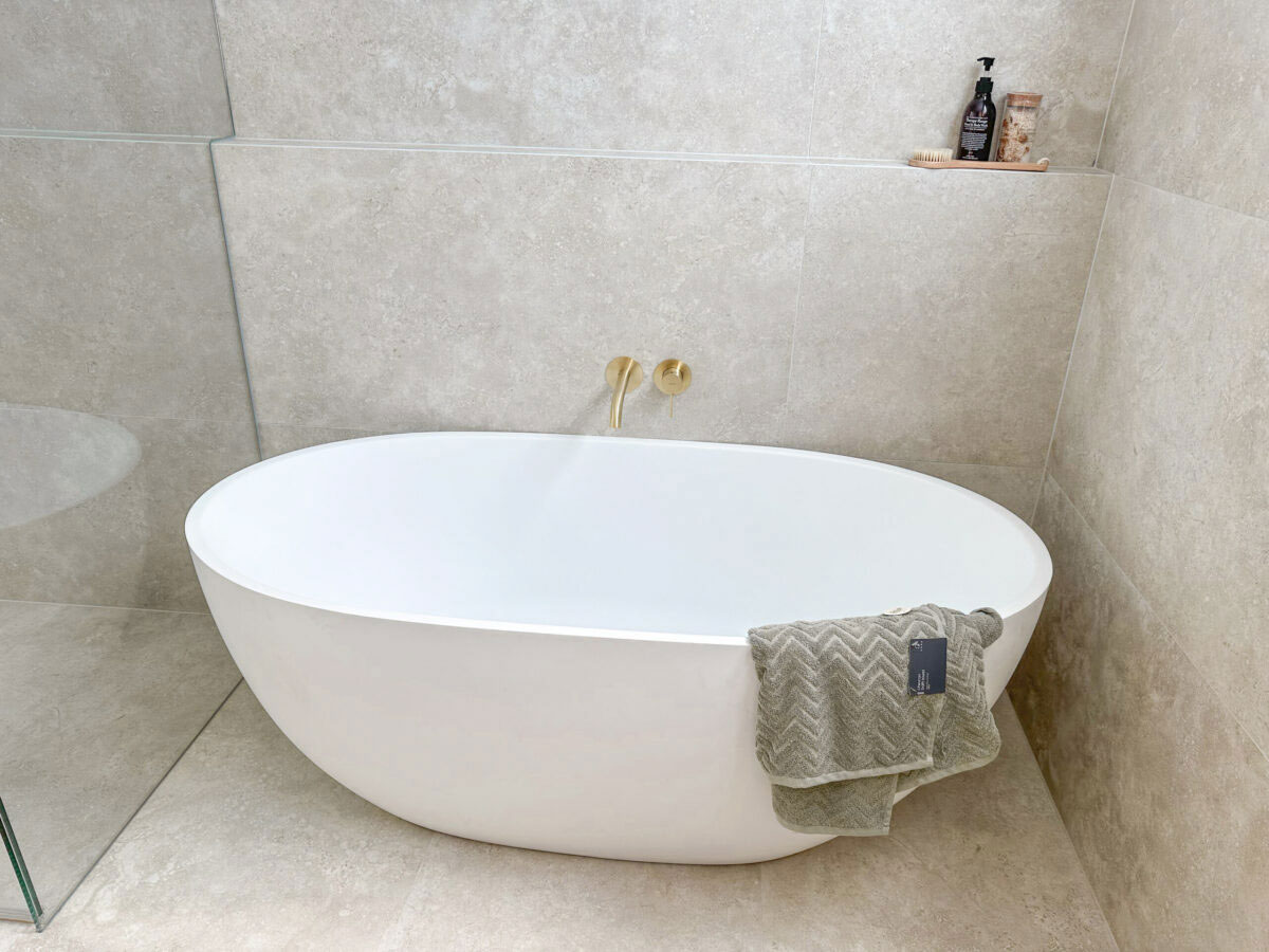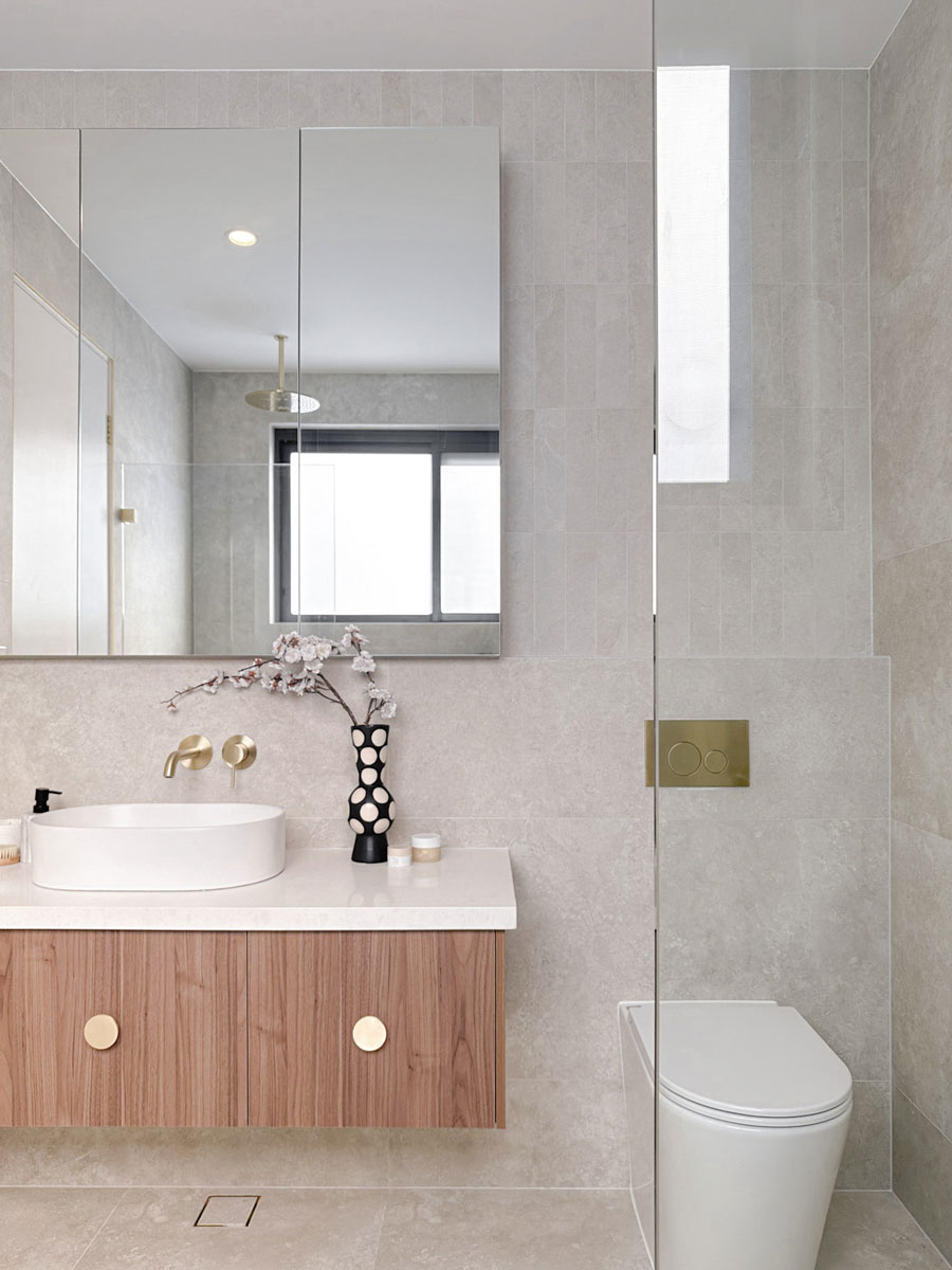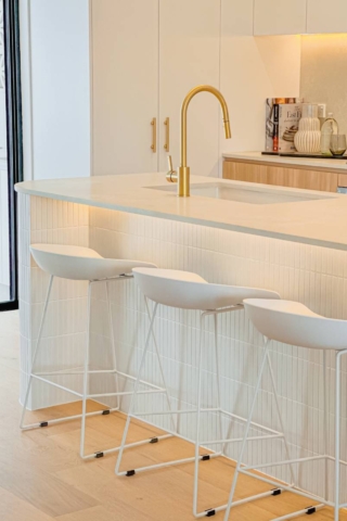 Defined by a coastal luxury palette, this design features Fraser Bianco stone-look tiles complemented by delicate White Matt Kit Kat...