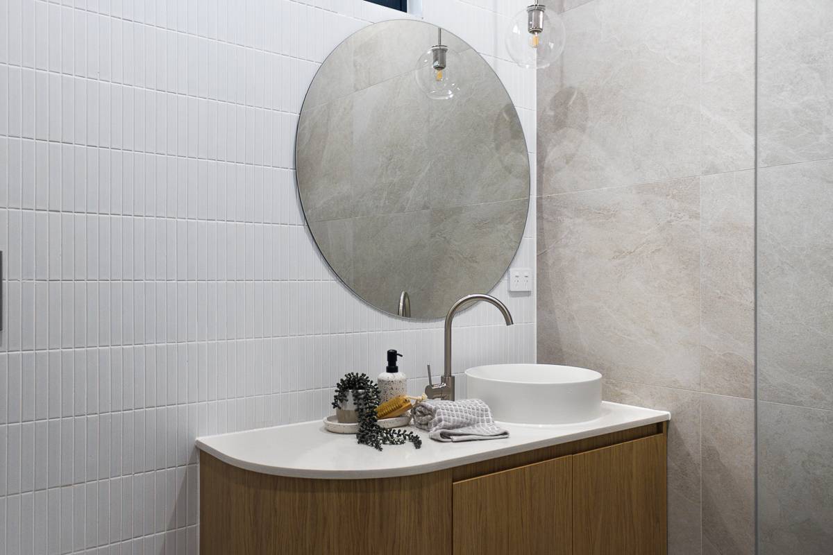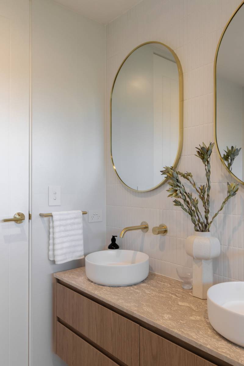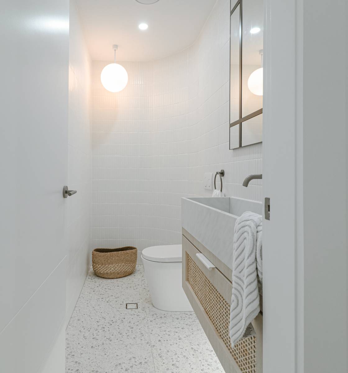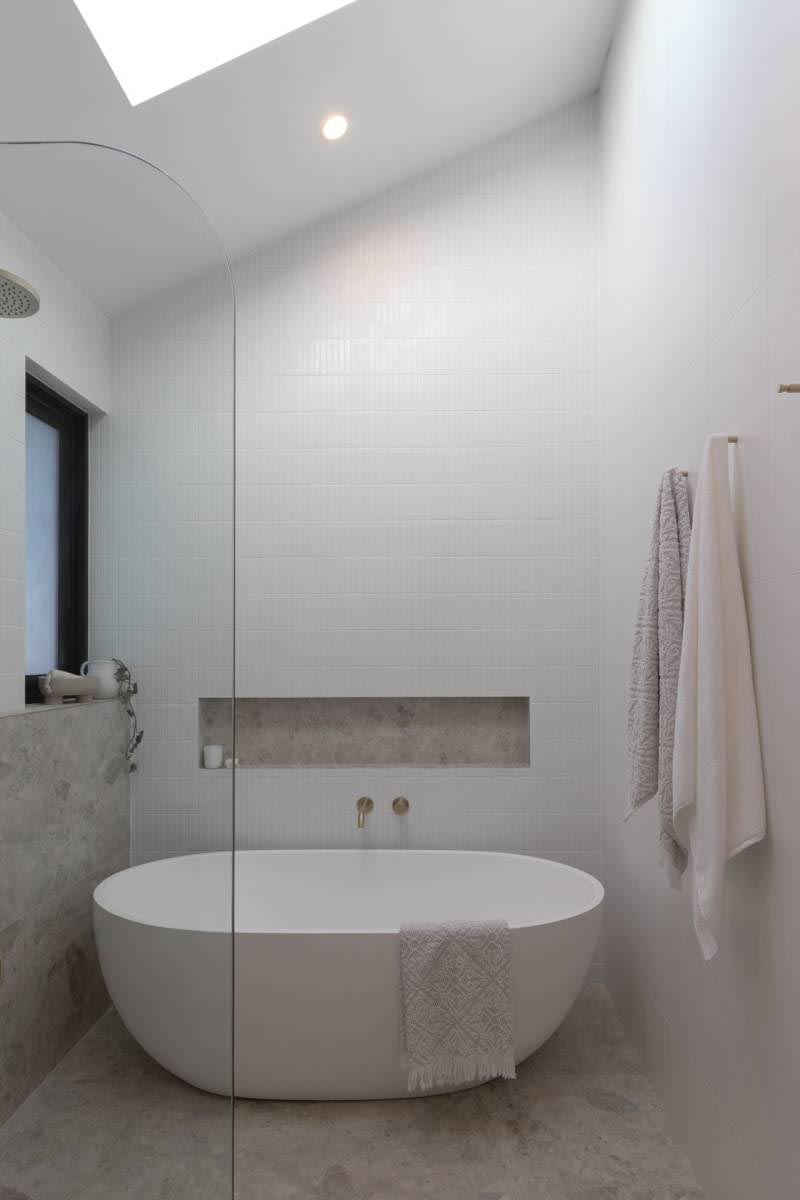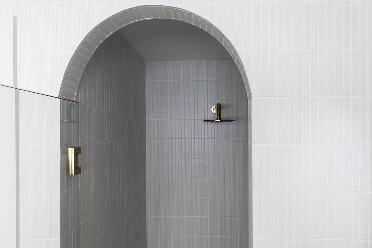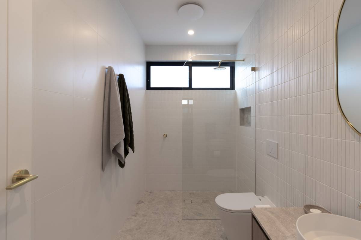 Defined by a coastal luxury palette, this design features Fraser Bianco stone-look tiles complemented by delicate White Matt Kit Kat...