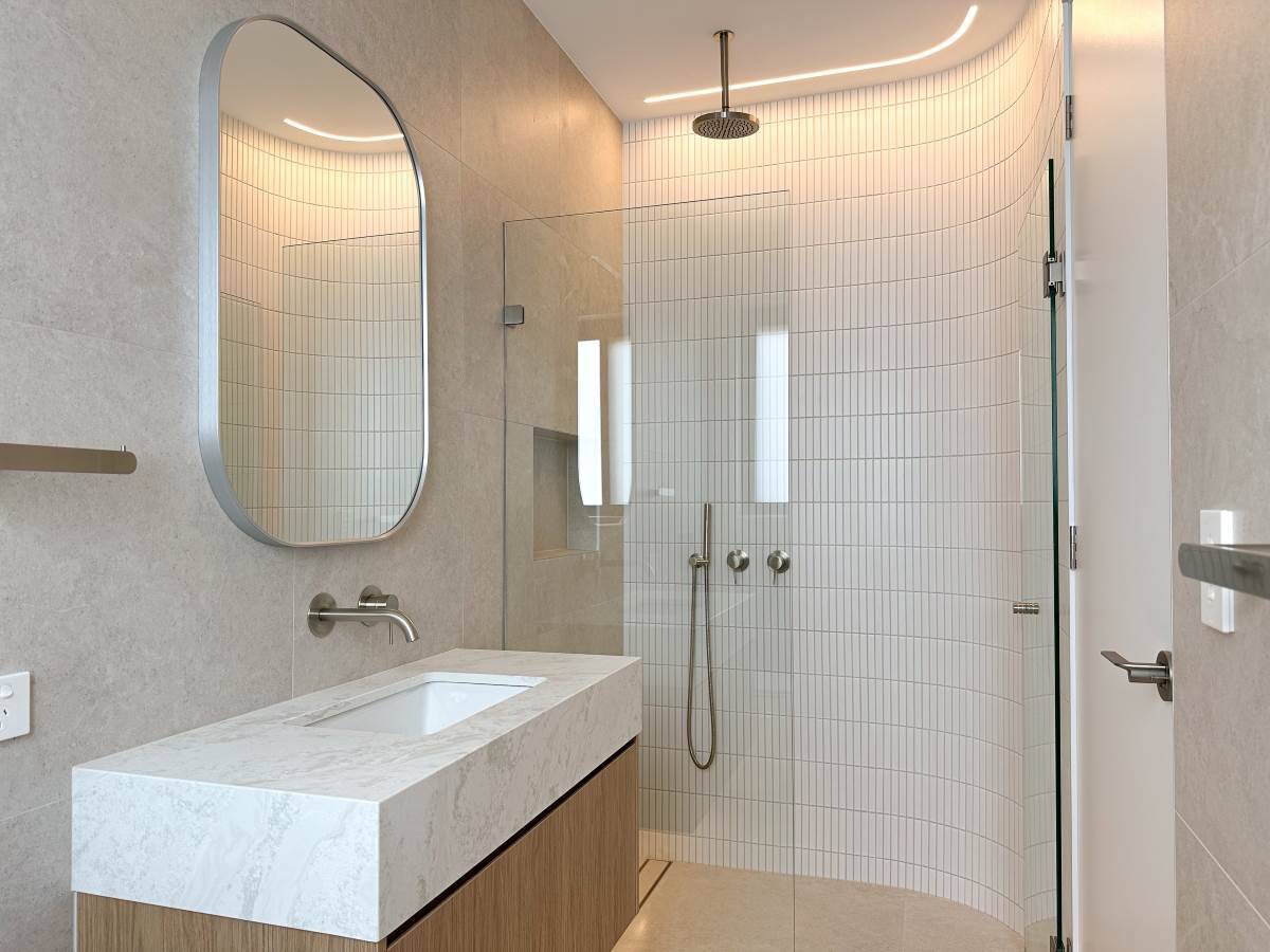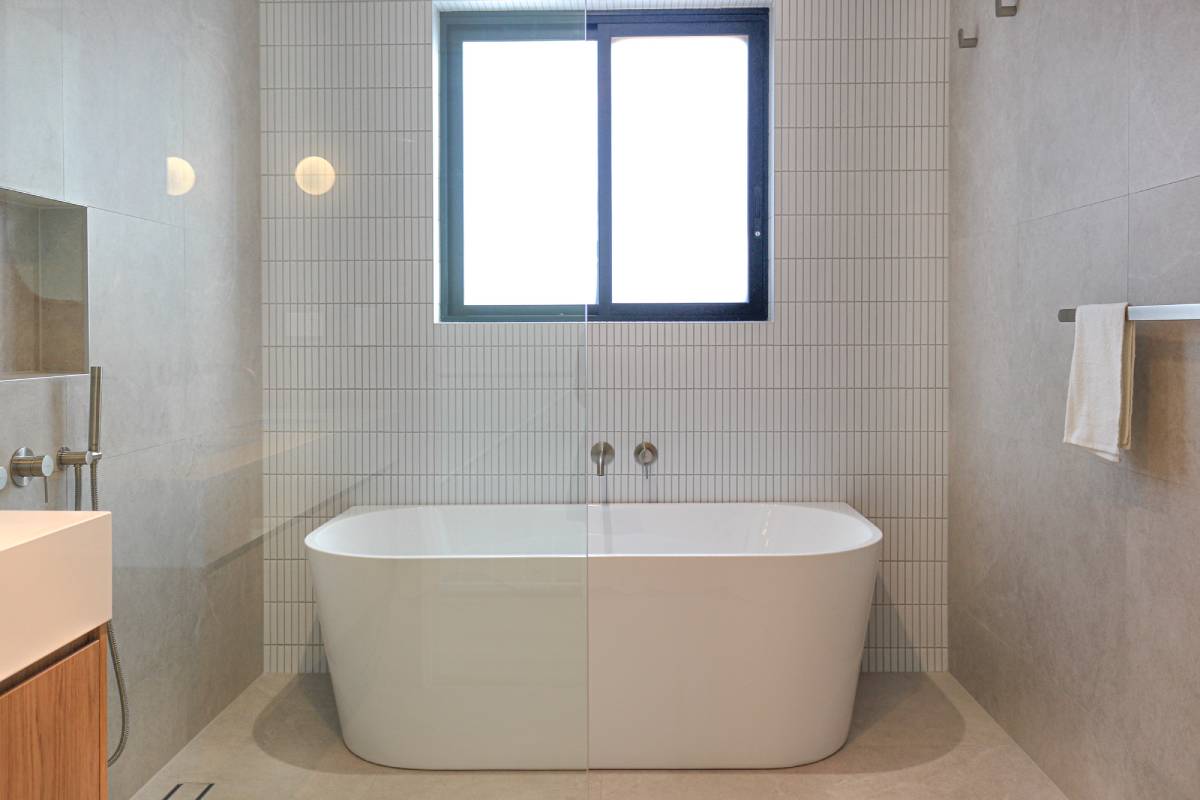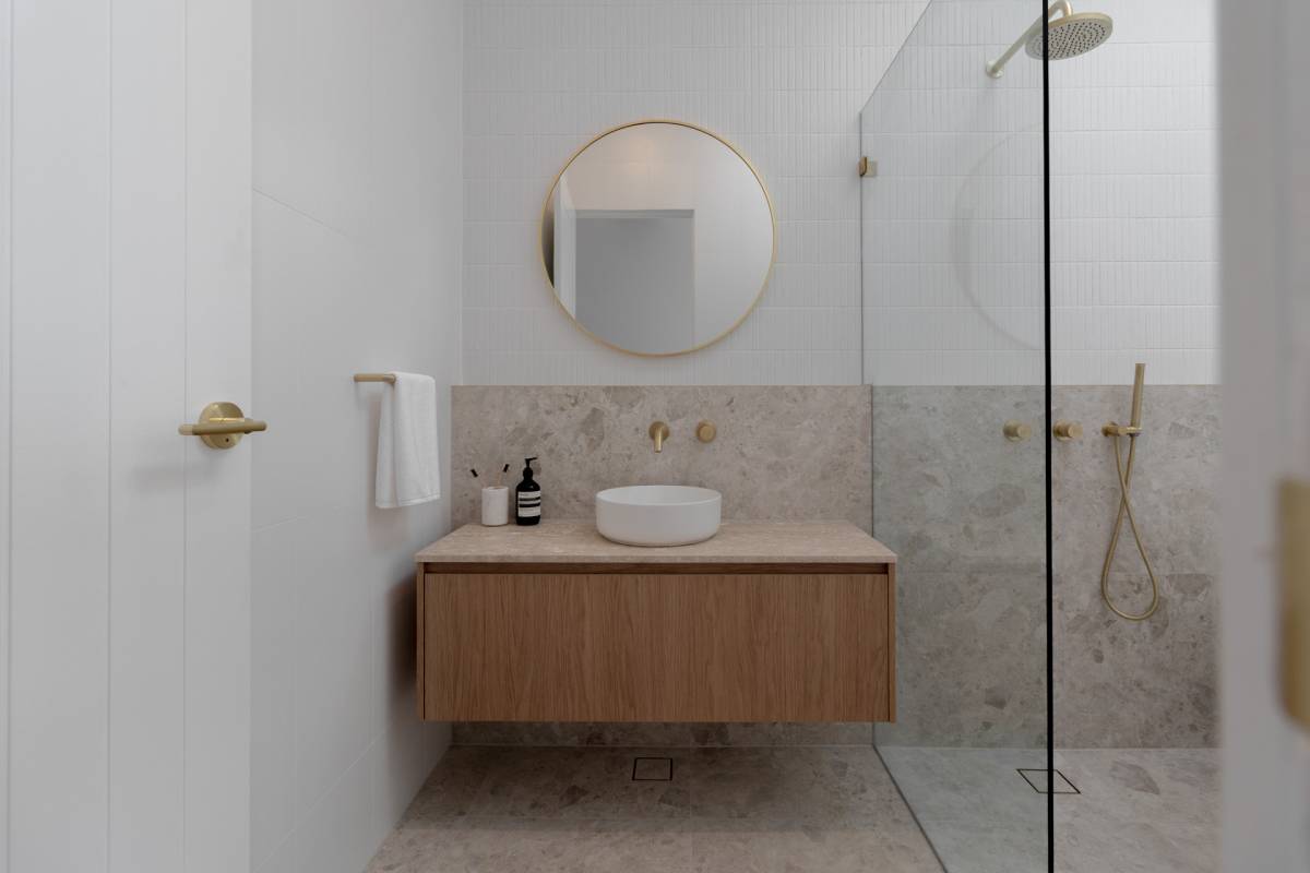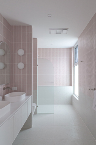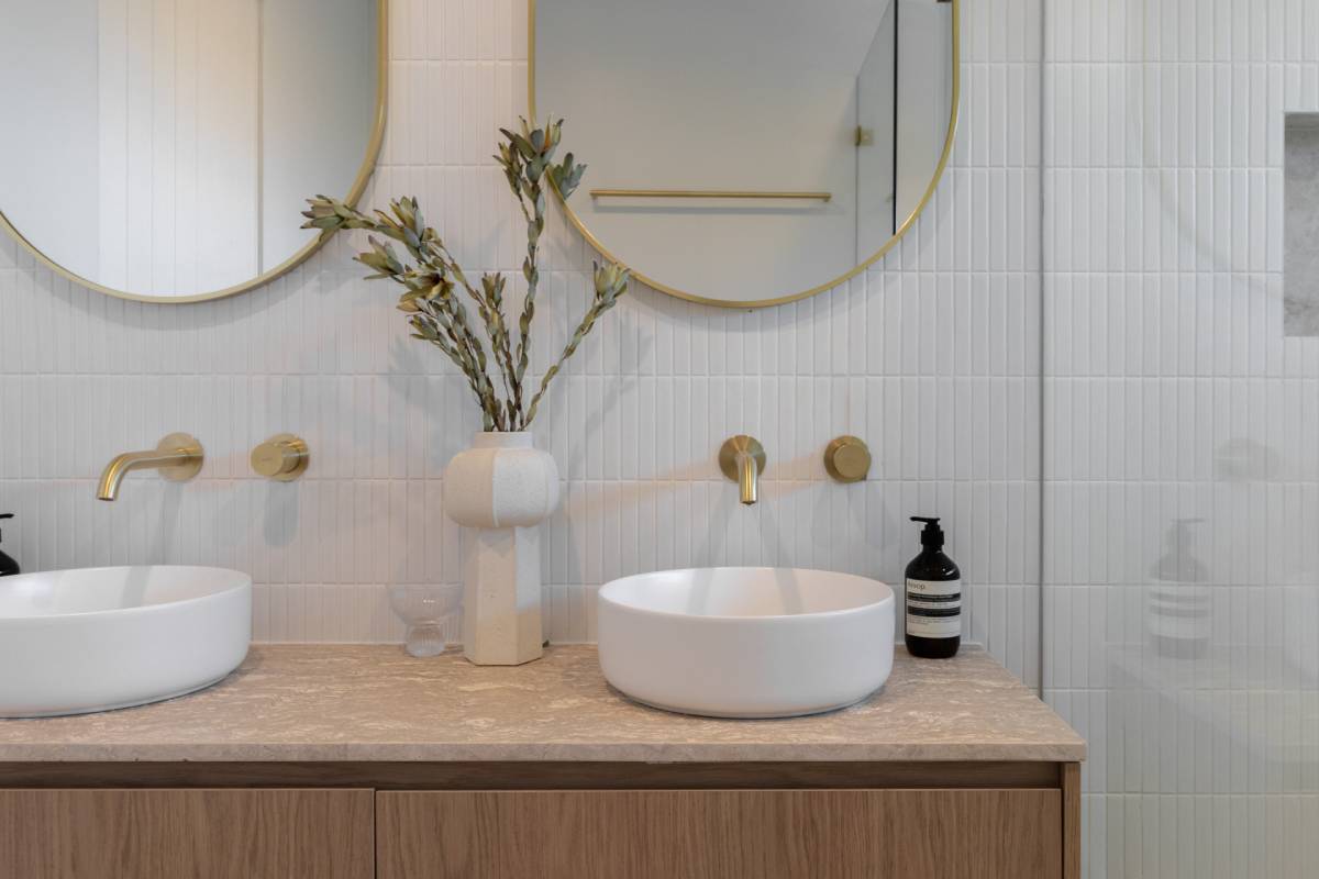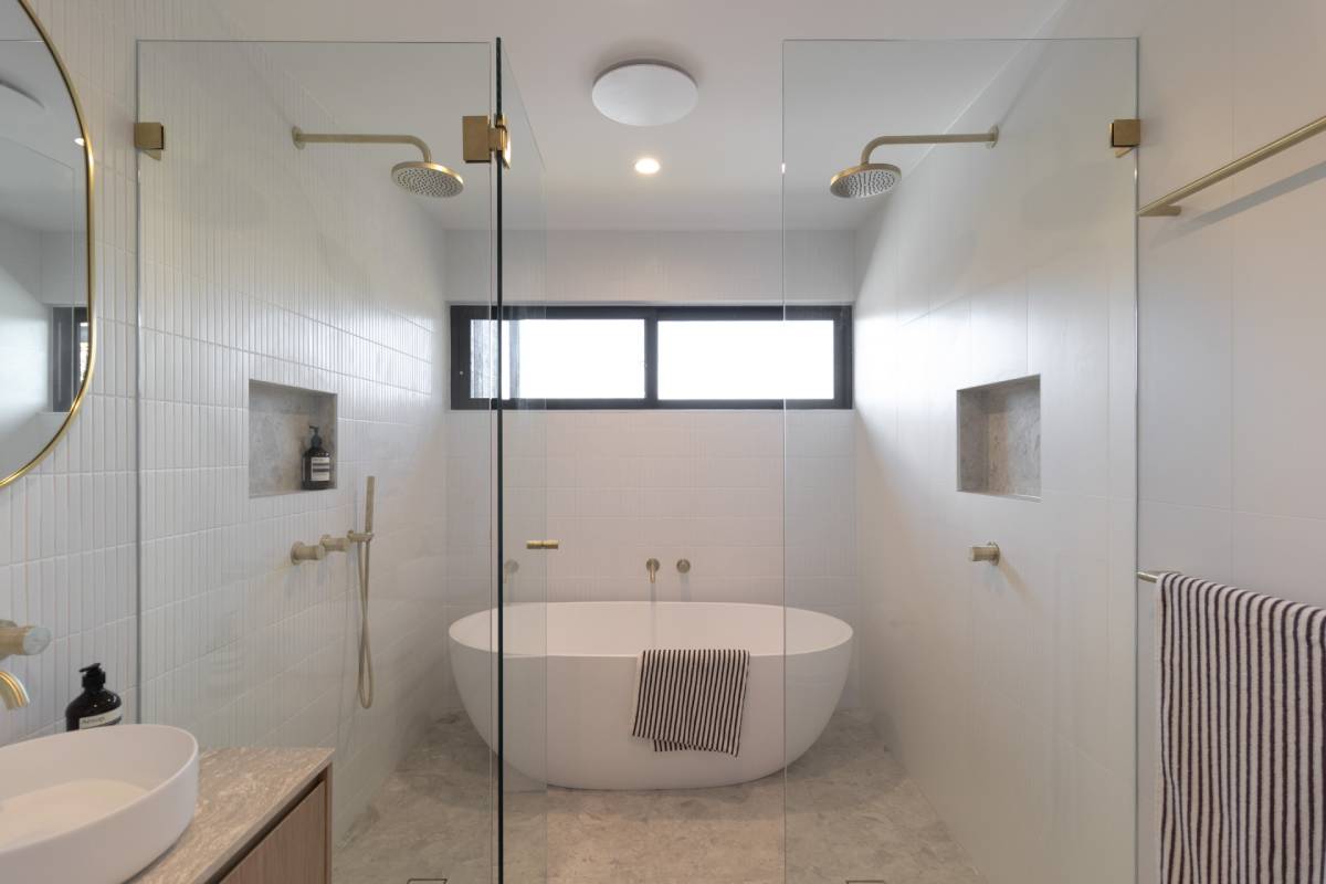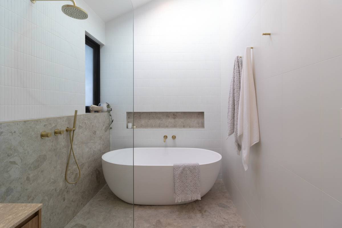 Defined by a coastal luxury palette, this design features Fraser Bianco stone-look tiles complemented by delicate White Matt Kit Kat...