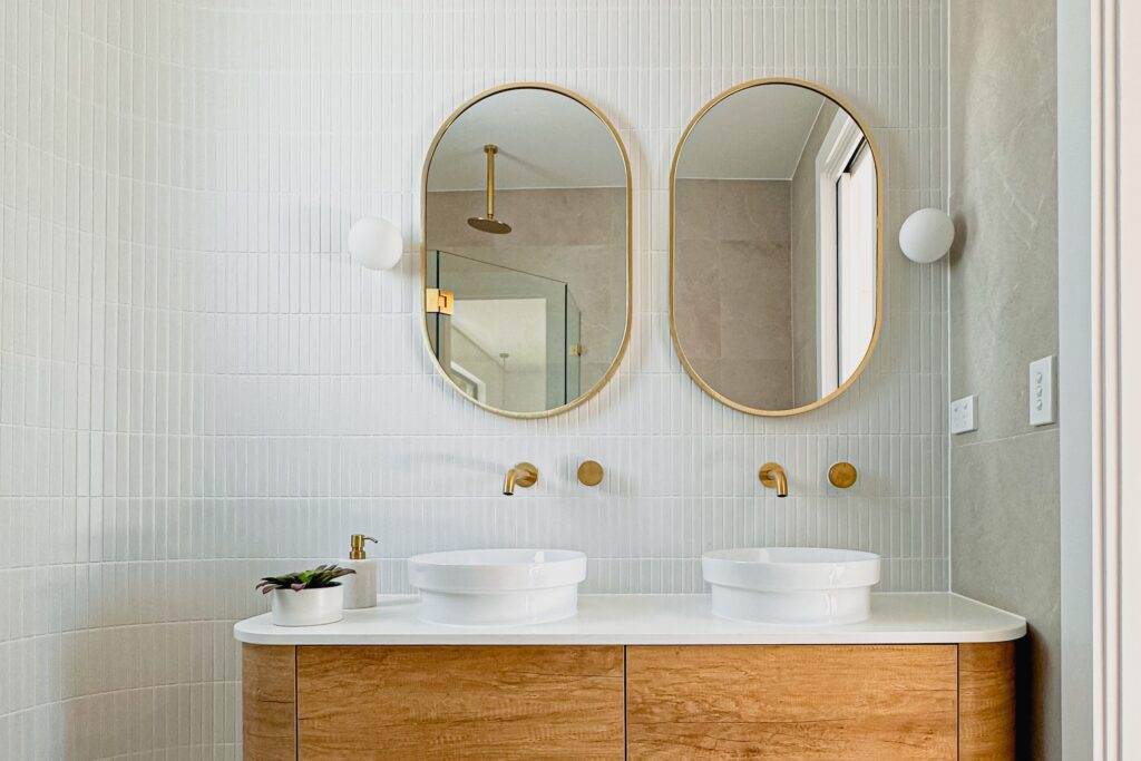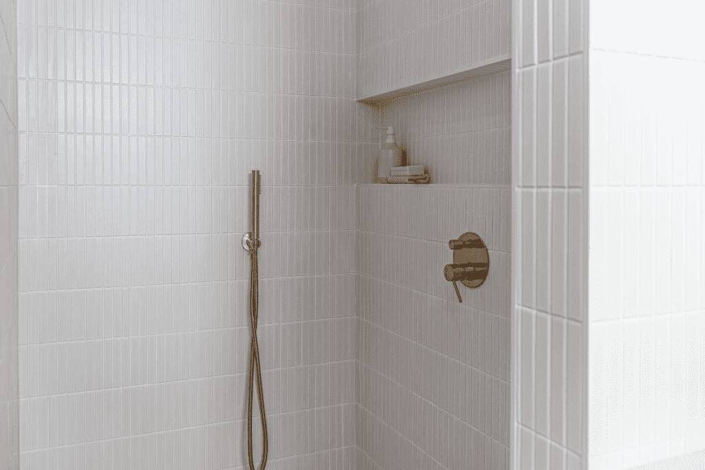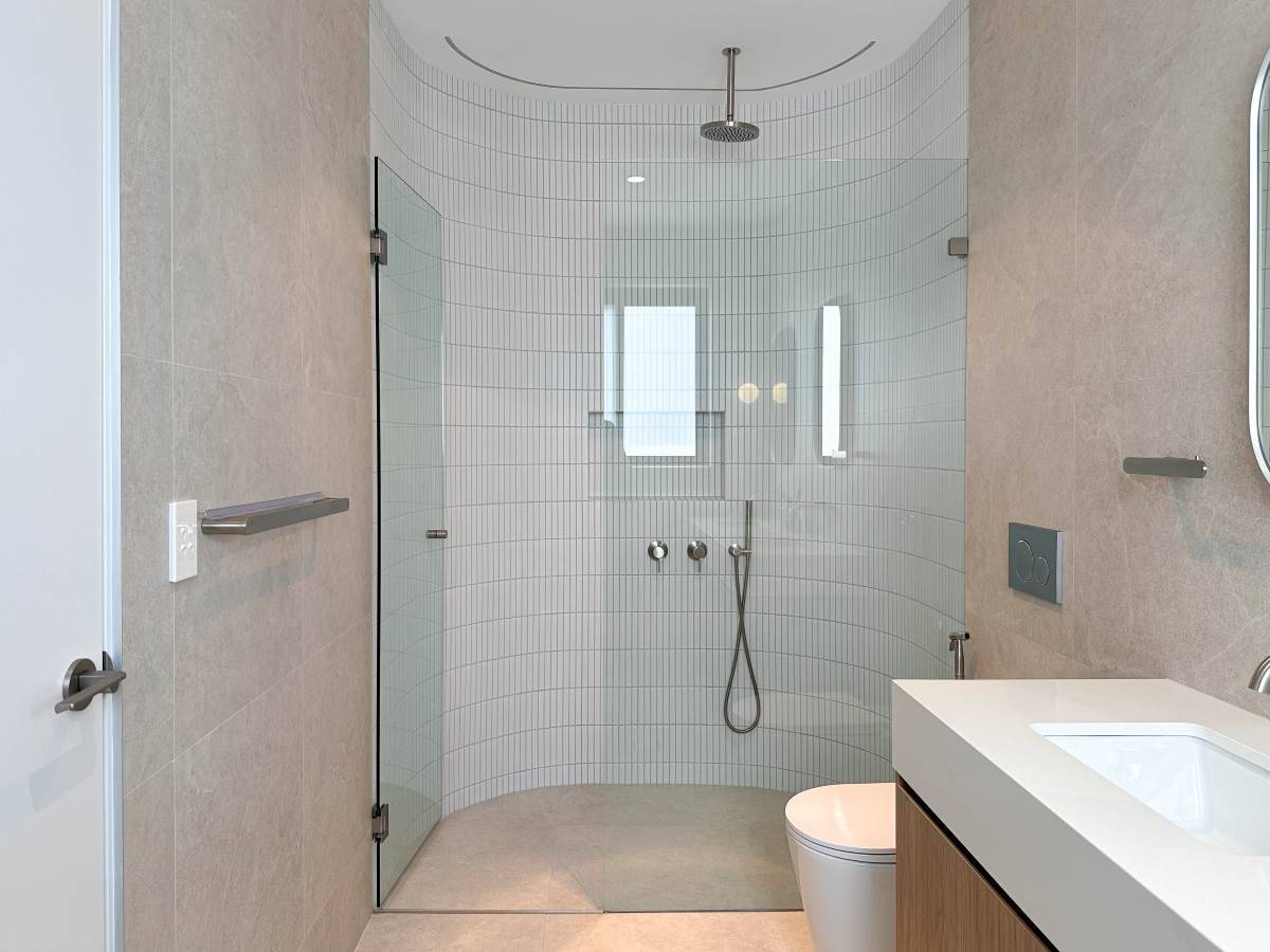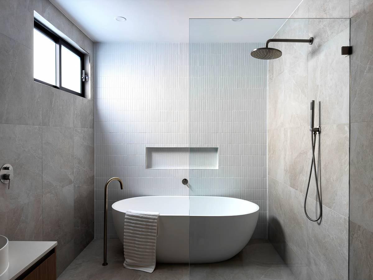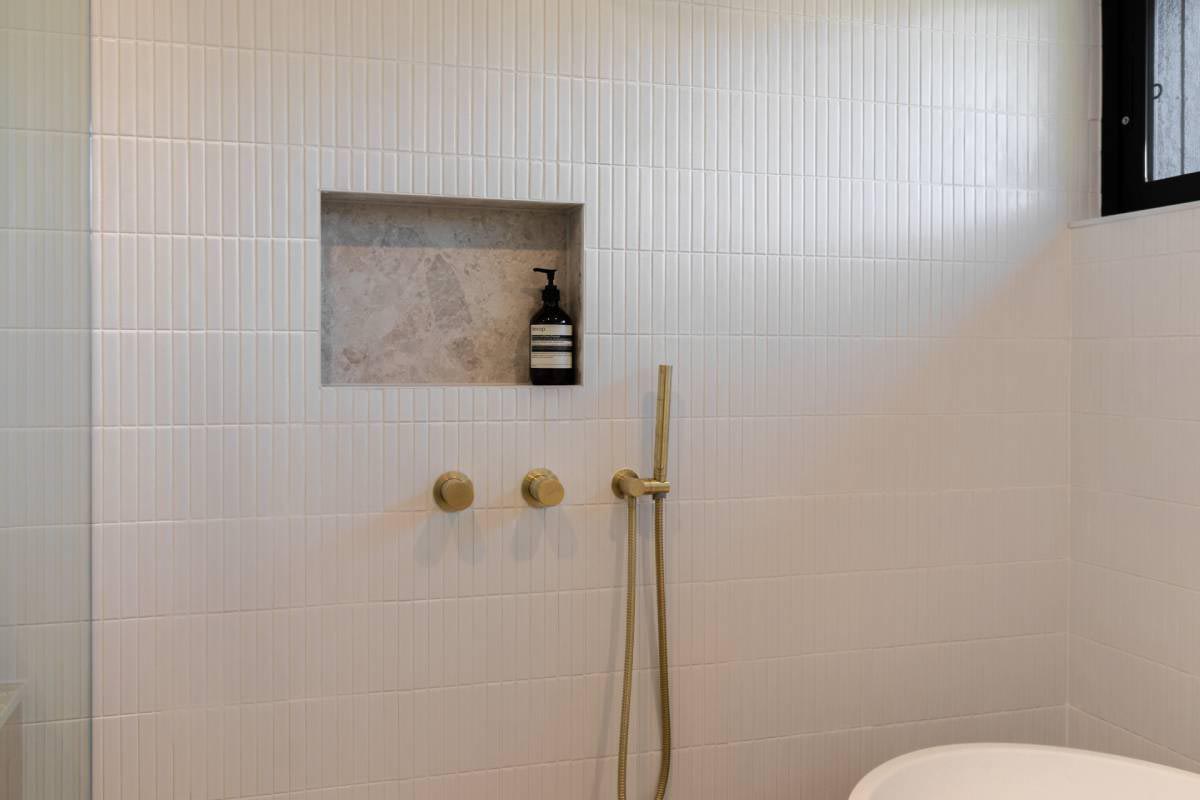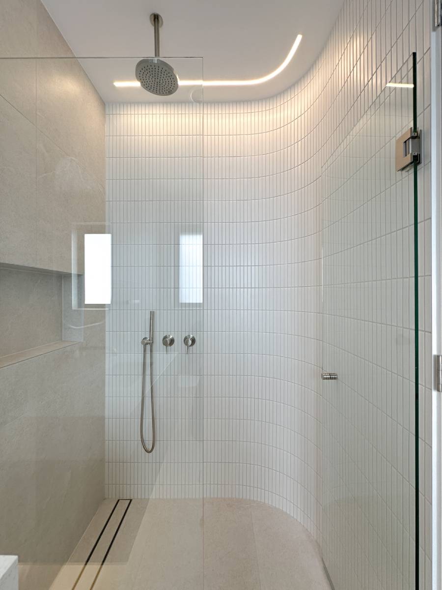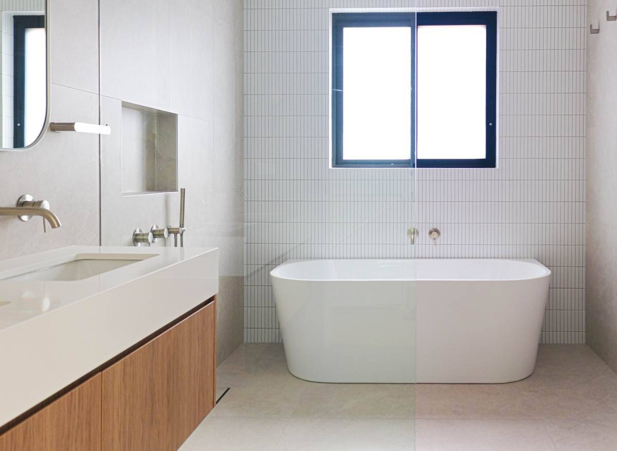Defined by a coastal luxury palette, this design features Fraser Bianco stone-look tiles complemented by delicate White Matt Kit Kat...