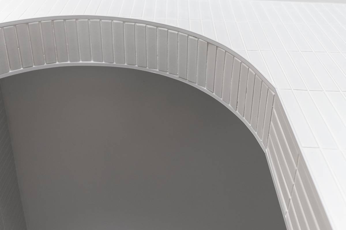 This project beautifully harmonises texture and tone by pairing Kit Kat White Matt mosaics with the robust character of Big Rock...