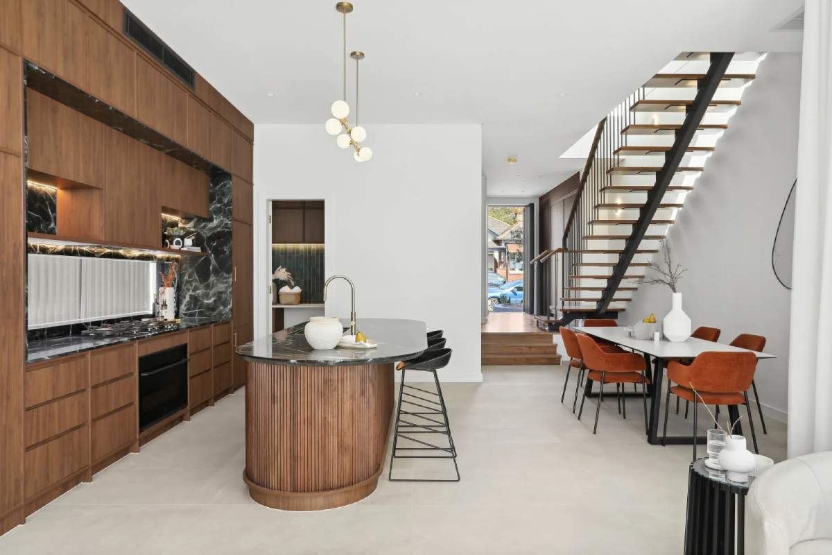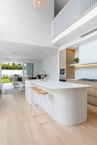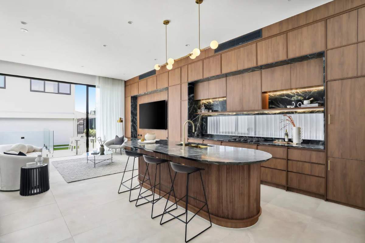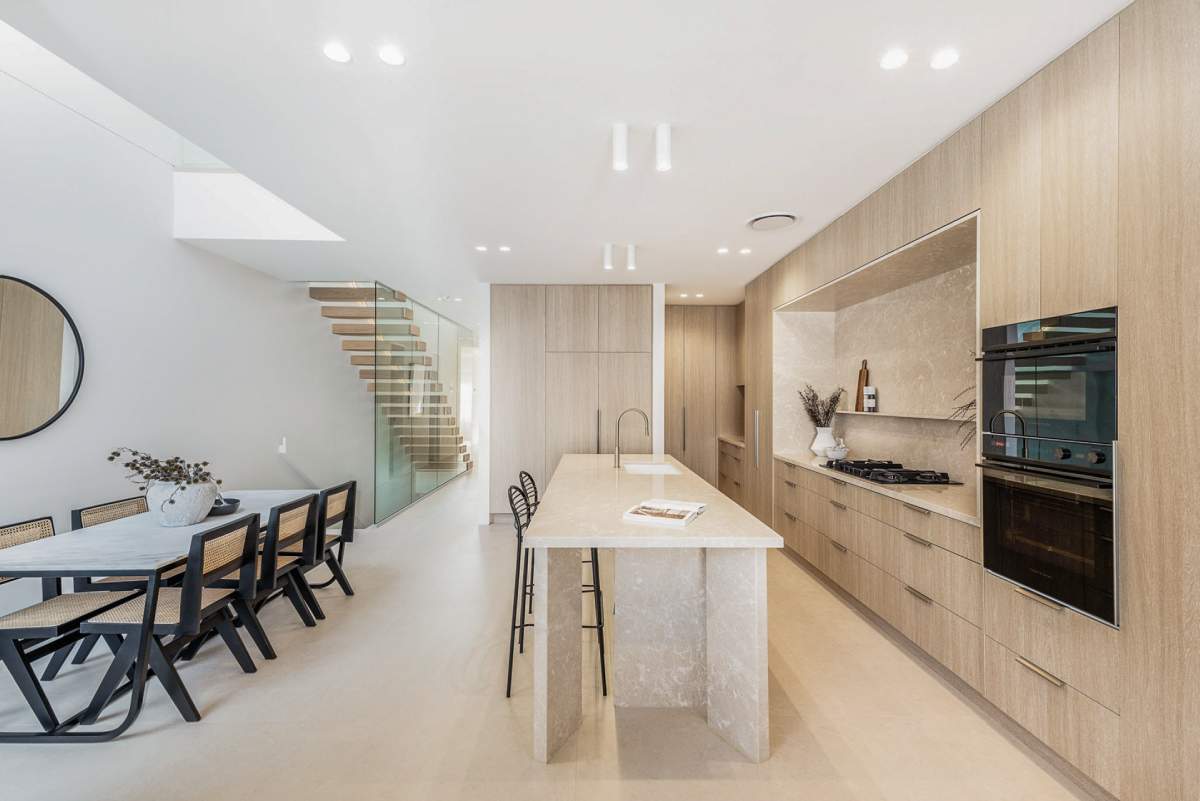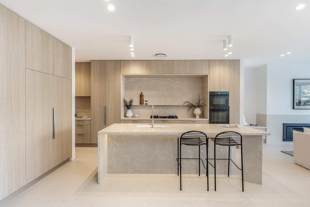 Forest Project showcases a classic coastal aesthetic, centred around a kitchen adorned with travertine mosaic tiles that perfectly...