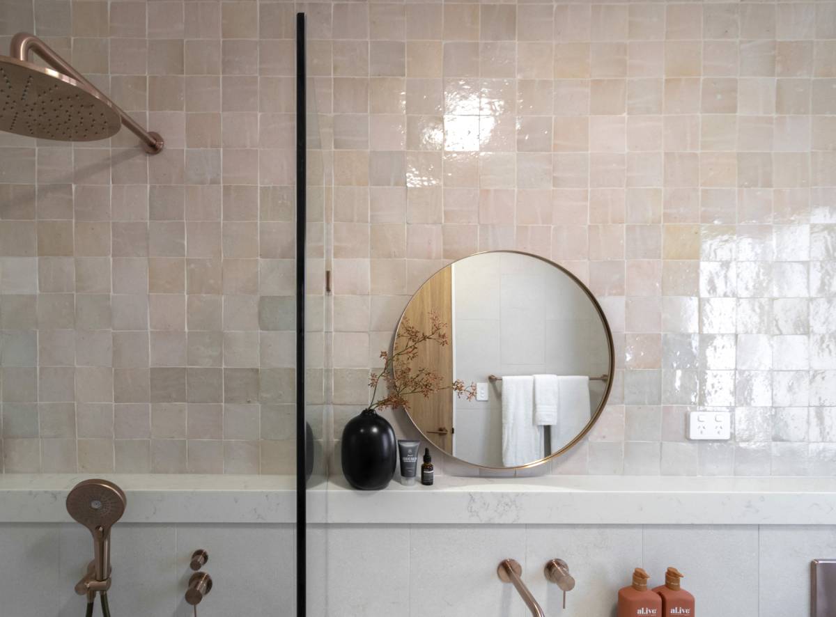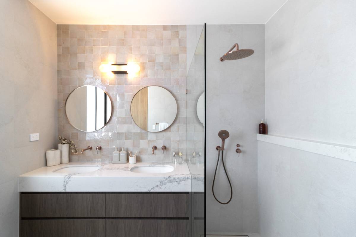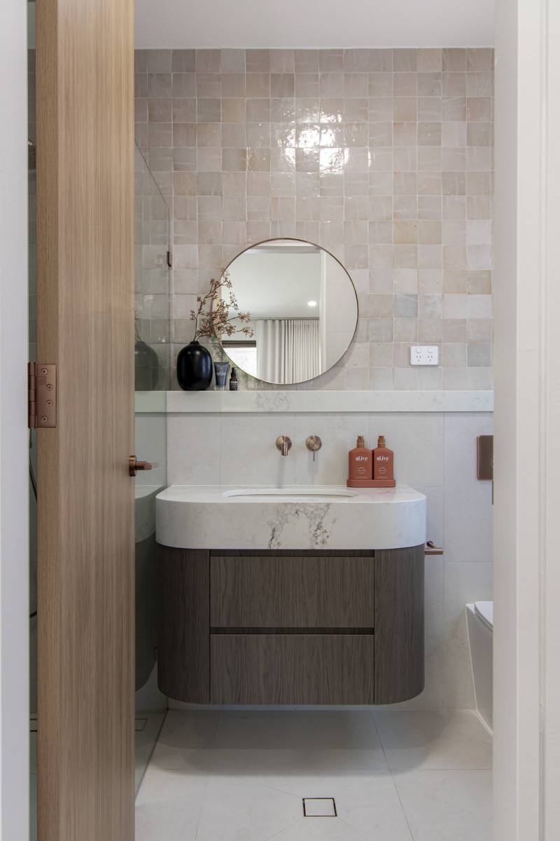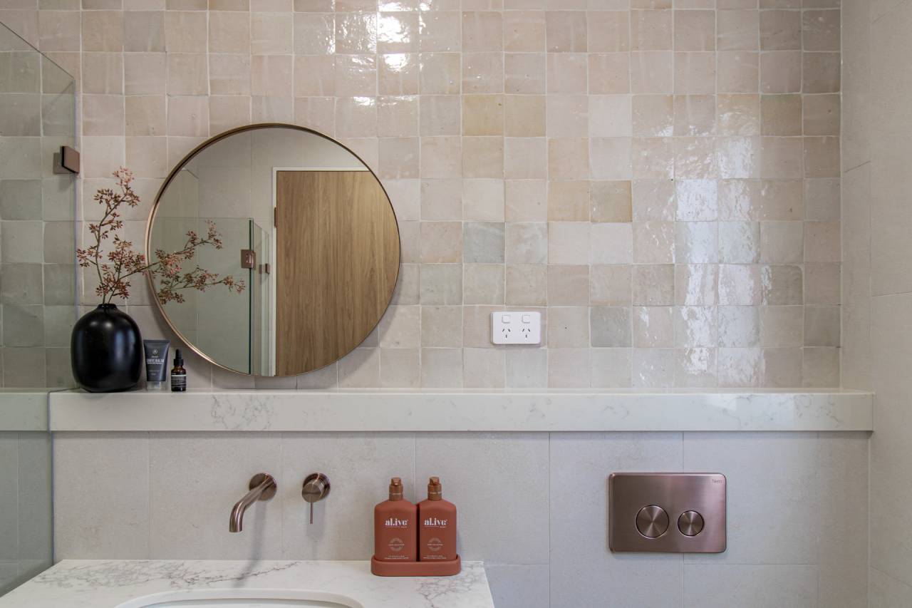 This space is an exercise in soft minimalism, pairing matte stone tiles with handmade-look splashbacks for a subtle, artisanal touch....