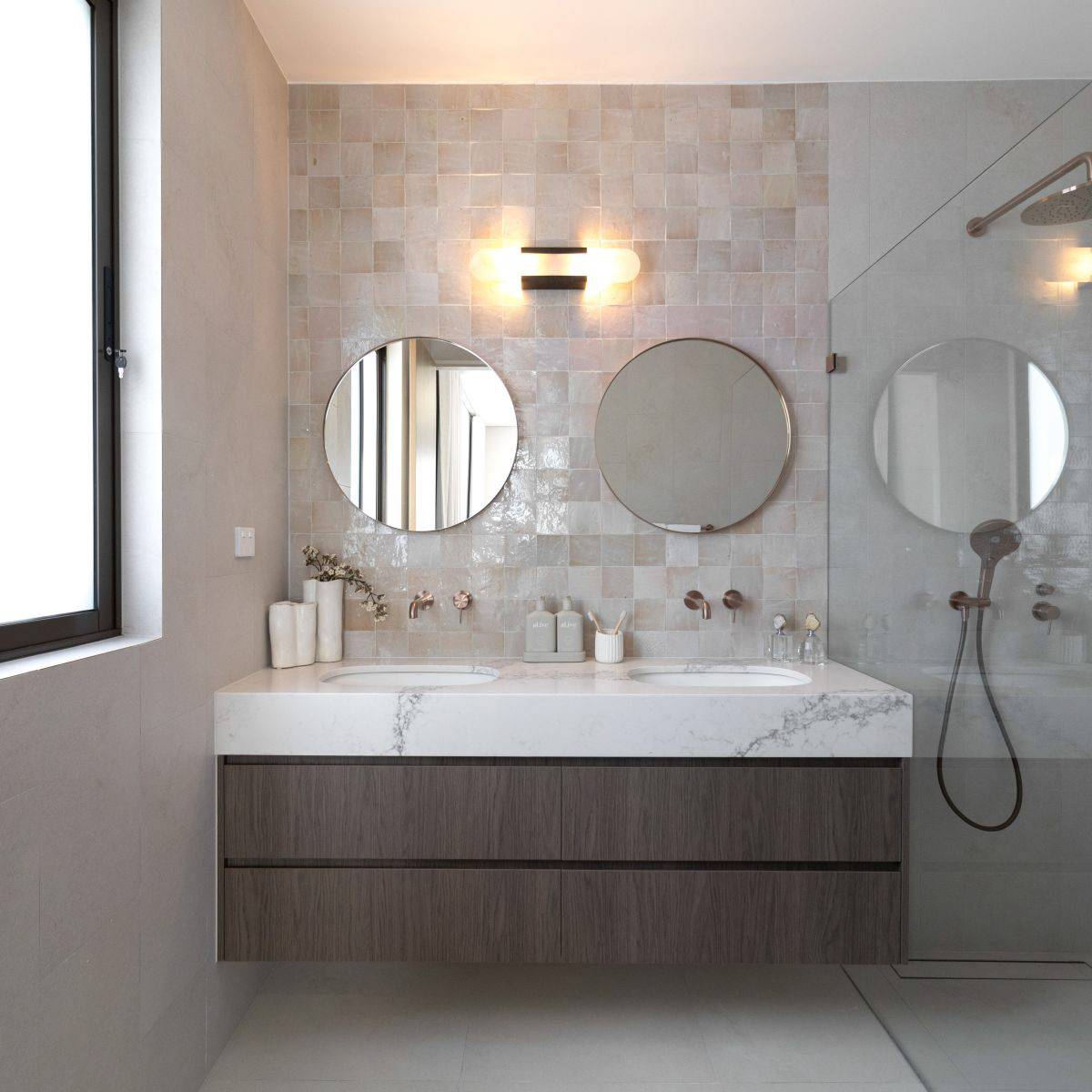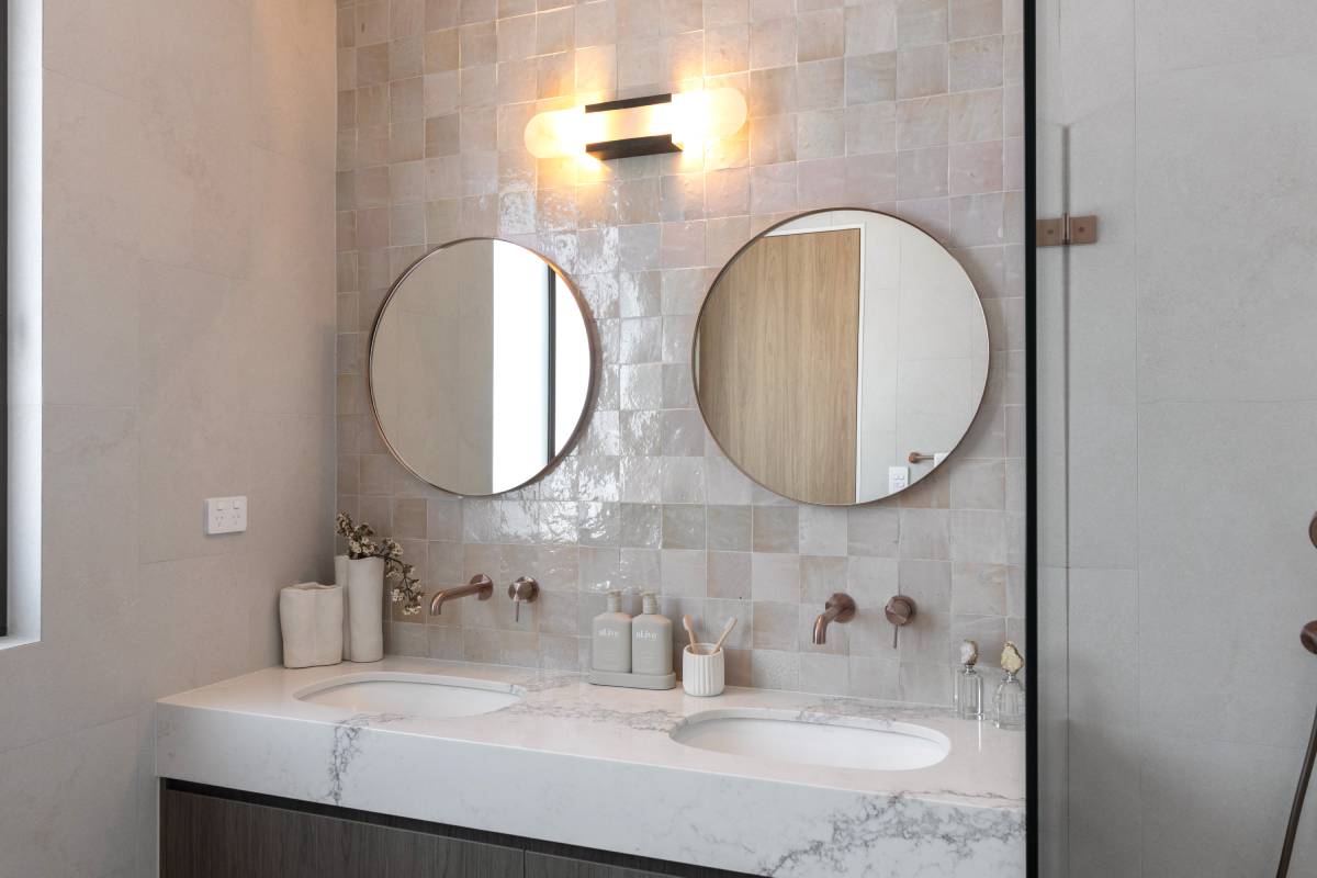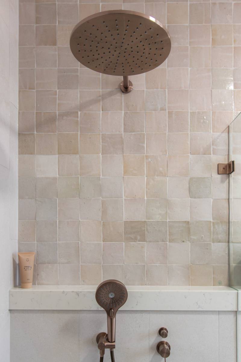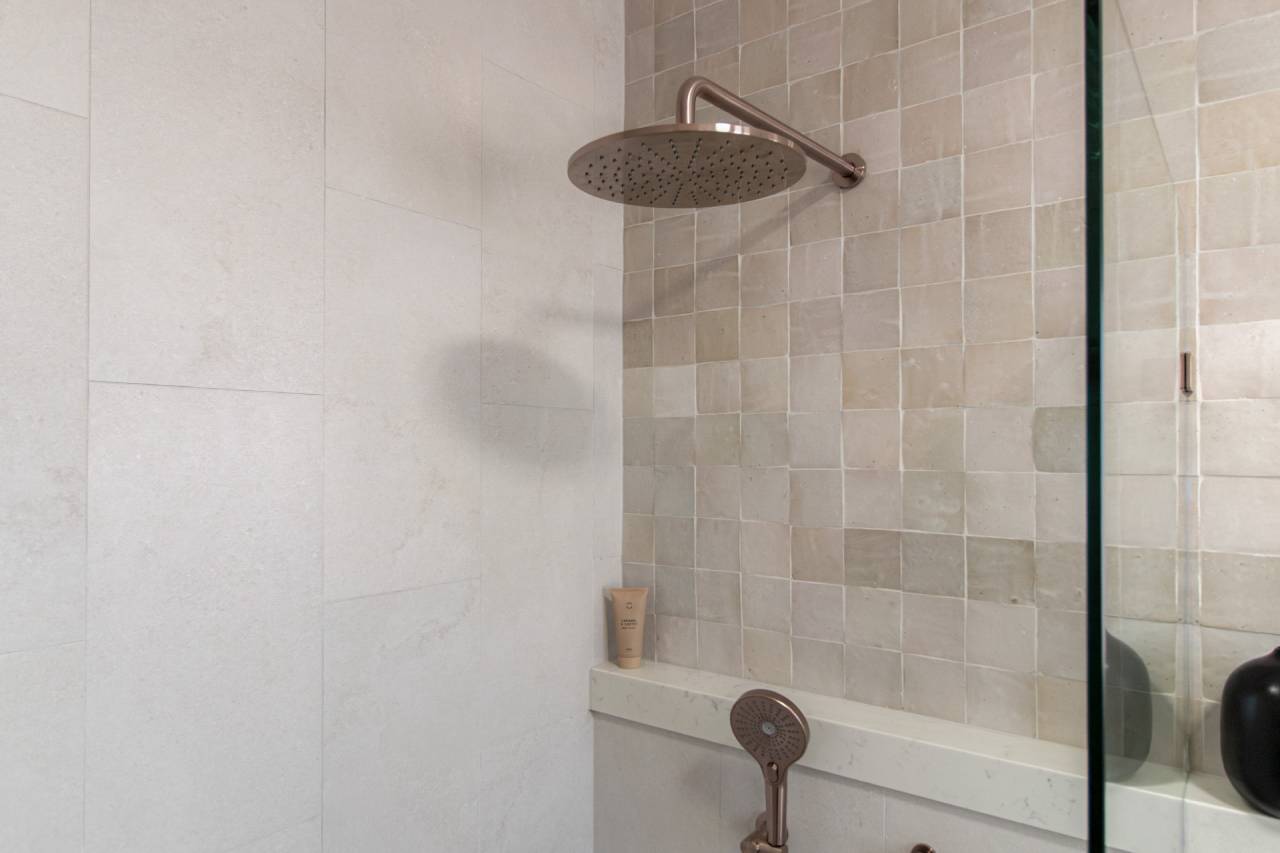 This space is an exercise in soft minimalism, pairing matte stone tiles with handmade-look splashbacks for a subtle, artisanal touch....