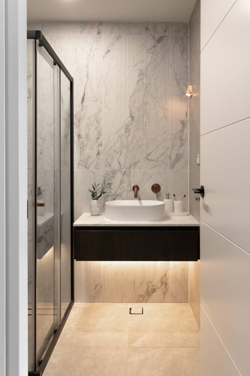 This expansive build focuses on architectural depth, featuring the Dante Earl Grey series in various finishes, from Lappato to...
