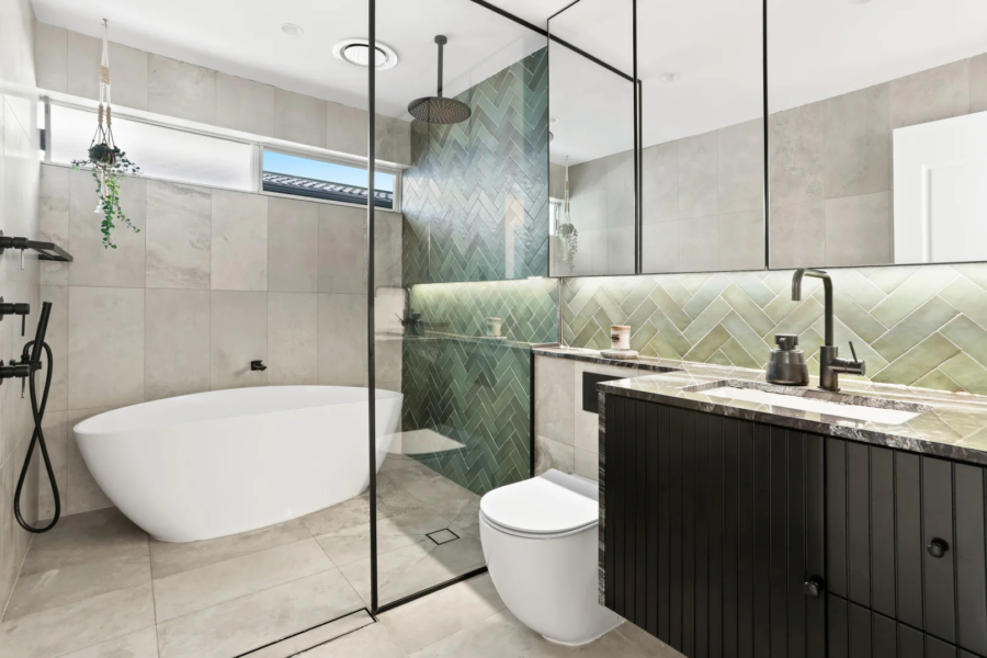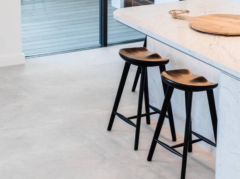 Showtile style expertise: Pairing concrete-look porcelain with a soft linen or oak palette creates quiet sophistication. The finish carries the texture of authenticity while delivering ease of maintenance.