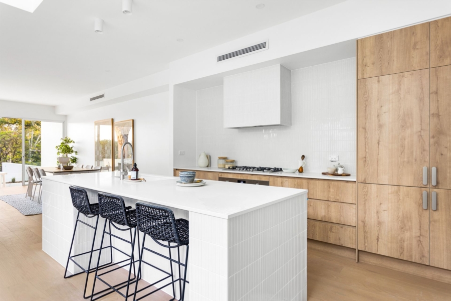 Glazed finishes above the benchtop can bounce light into the work zone. Pair with a honed stone-look floor for warmth and practicality. Use the same tonal palette in both finishes rather than mixing extremes.