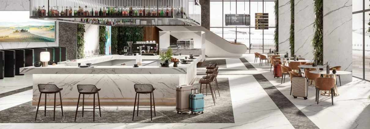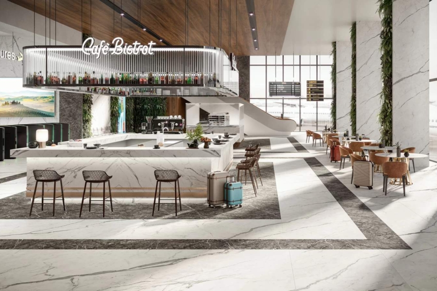 Between the extremes of gloss and matte lies an entire world of subtlety. Honed and satin finishes are increasingly favoured by architects seeking controlled light diffusion. A honed surface softens light without dulling it. It reveals the natural variation of the material, especially in stone-look or terrazzo look tiles. The finish is tactile, grounded and timeless, suitable for spaces that value warmth over shine. Satin finishes carry a gentle glow that feels effortless. They are often used to connect zones across open-plan interiors, bridging glossy feature walls and matte floors. This continuity helps maintain balance while avoiding visual monotony.