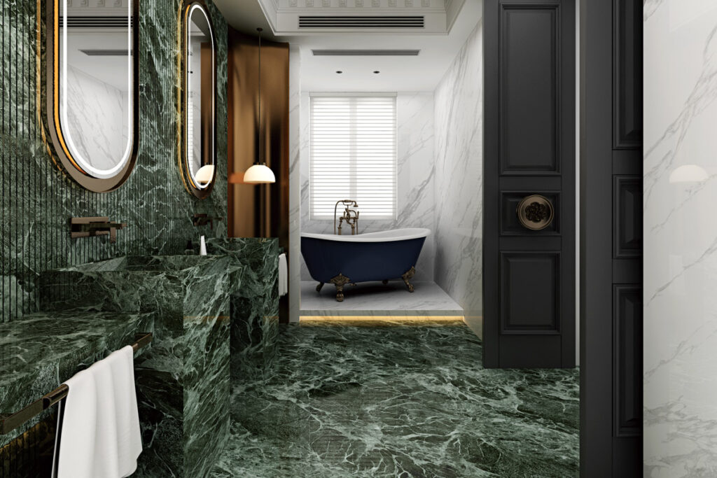 Meanwhile, installing warm lighting enhances the softness of honed tiles, while cooler lighting sharpens glossy surfaces.